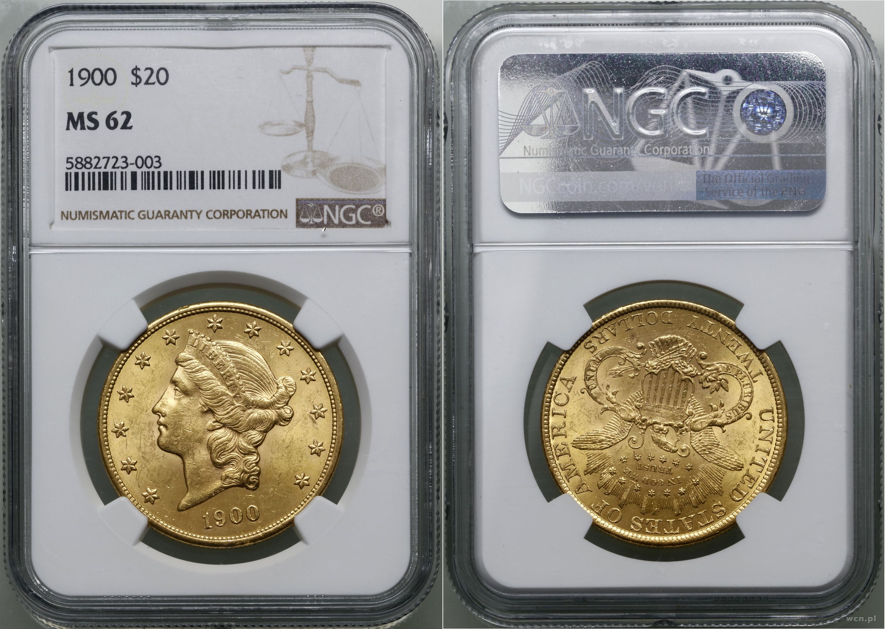 Opis: | USA, 20 dolarów 1900, Filadelfia, typ Liberty Head, z motto na rewersie i TWENTY DOLLARS, złoto ok. 33.43 g, próby 900, nakład: 1.874.460 szt., pięknie zachowane, w opakowaniu firmy NGC nr 5882723-003 z oceną MS62 |