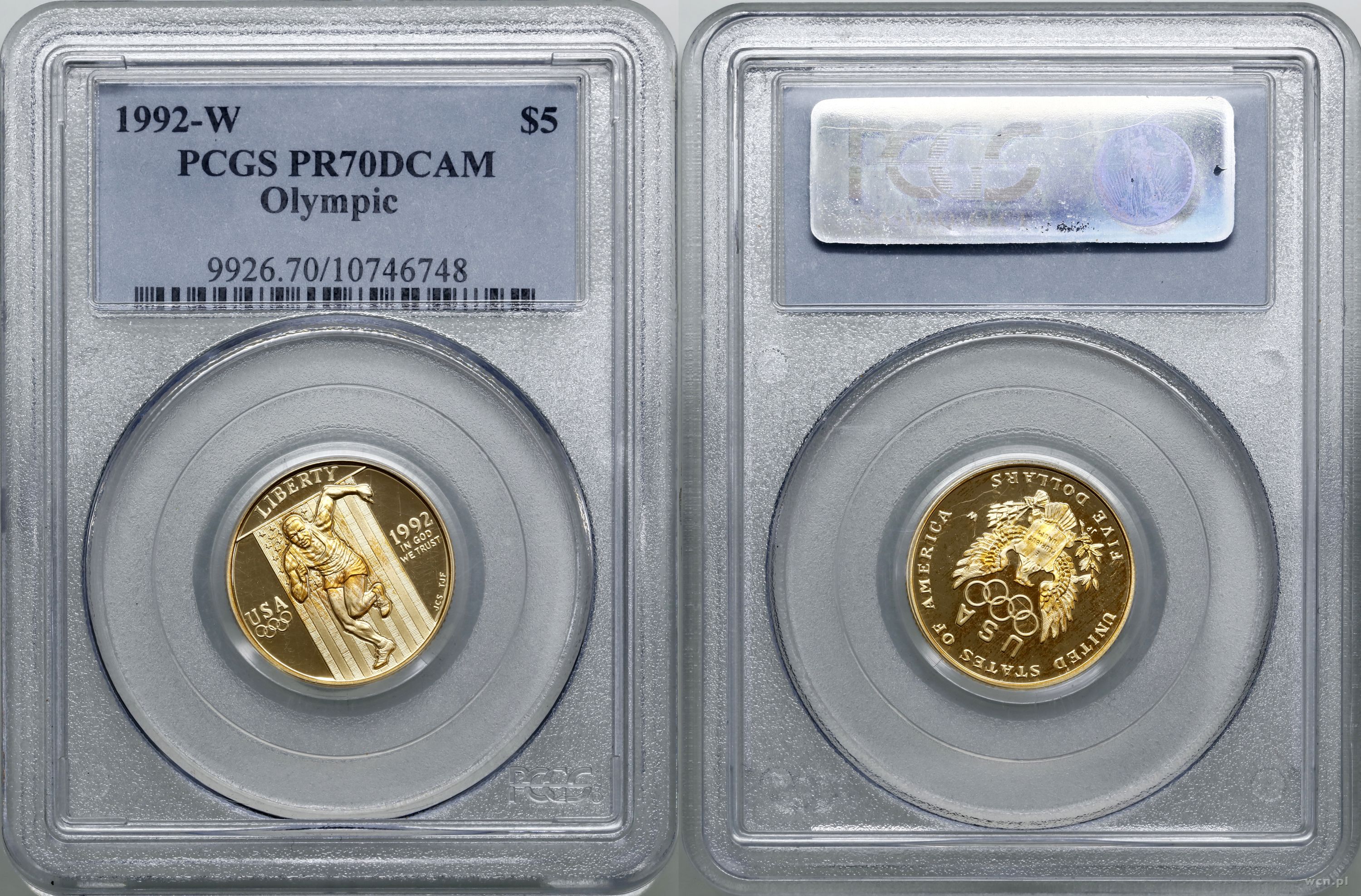 Opis: USA, 5 dolarów 1992 W, West Point, Olympics, Barcelona 1992, stempel lustrzany, złoto ok. 8.36 g, próby 900, nakład: 77.313 szt., idealnie zachowane, w opakowaniu firmy PCGS nr 10746748 z oceną PR70 DCAM
