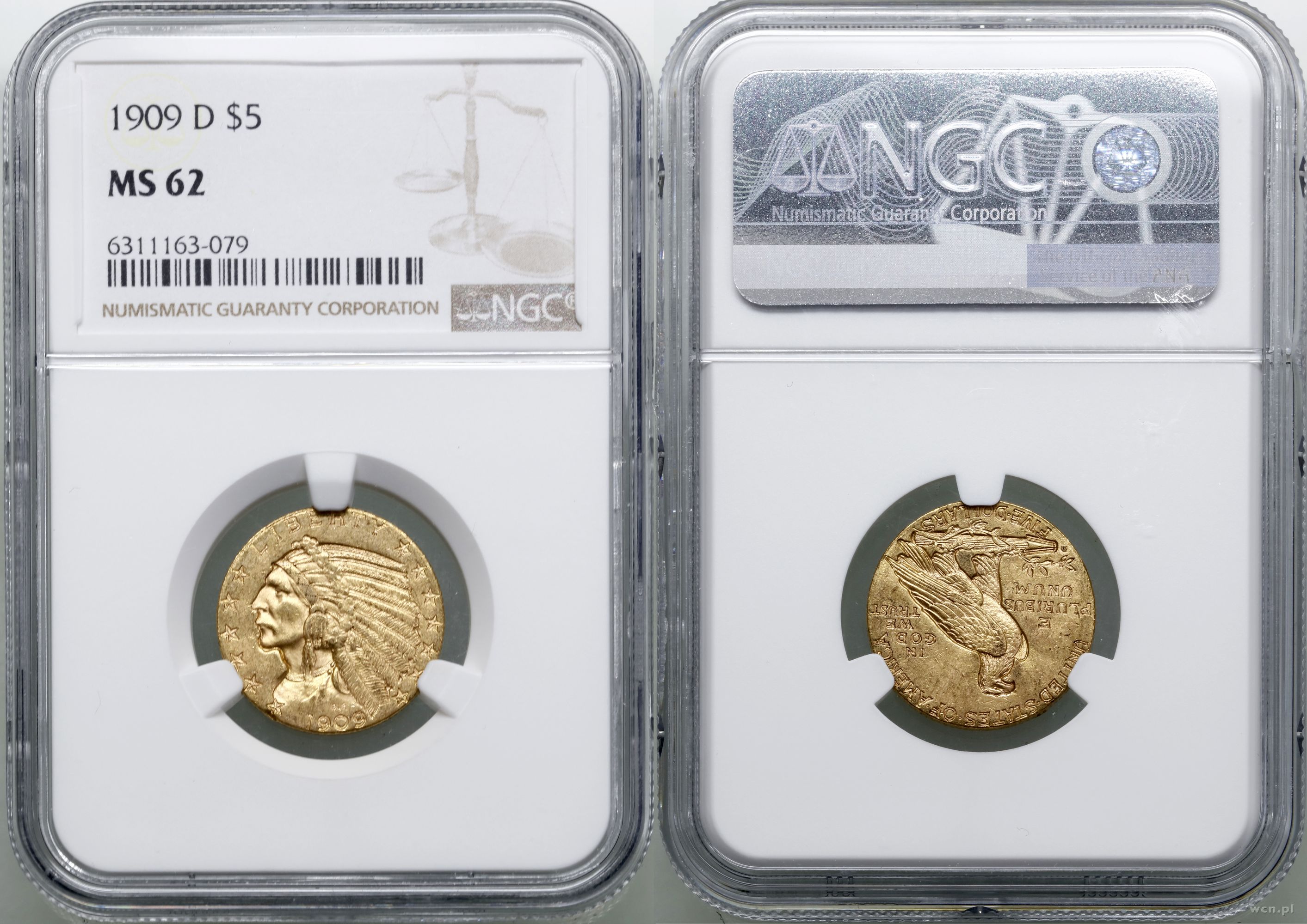 | Opis: | USA, 5 dolarów 1909 D, Denver, typ Indian Head, złoto ok. 8.36 g, próby 900, nakład: 3.423.560 szt., pięknie zachowane, w opakowaniu firmy NGC nr 6311163-070 z oceną MS62 |