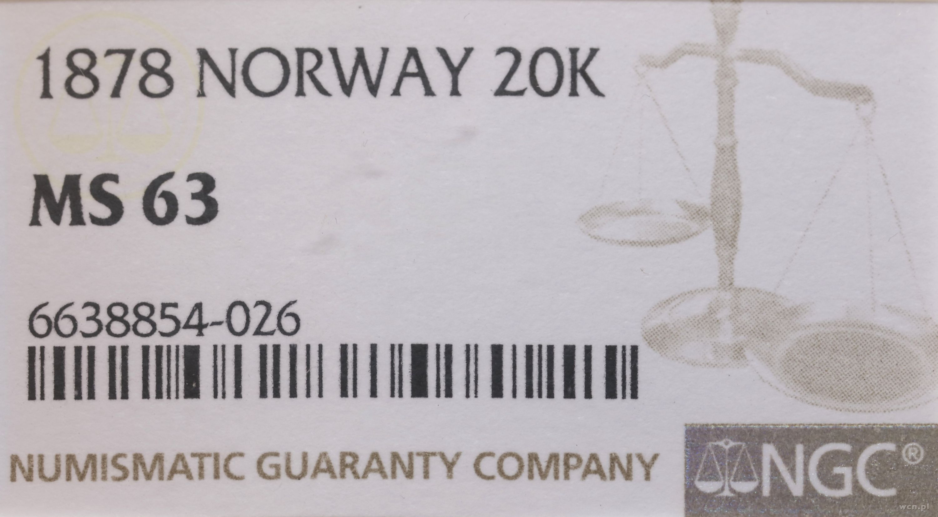 | Opis: | Europa, 20 koron 1878, Kongsberg, złoto ok. 8.96 g, próby 900, nakład: 139.000 szt., pięknie zachowane, w opakowaniu firmy NGC nr 6638854-026 z oceną MS63 |