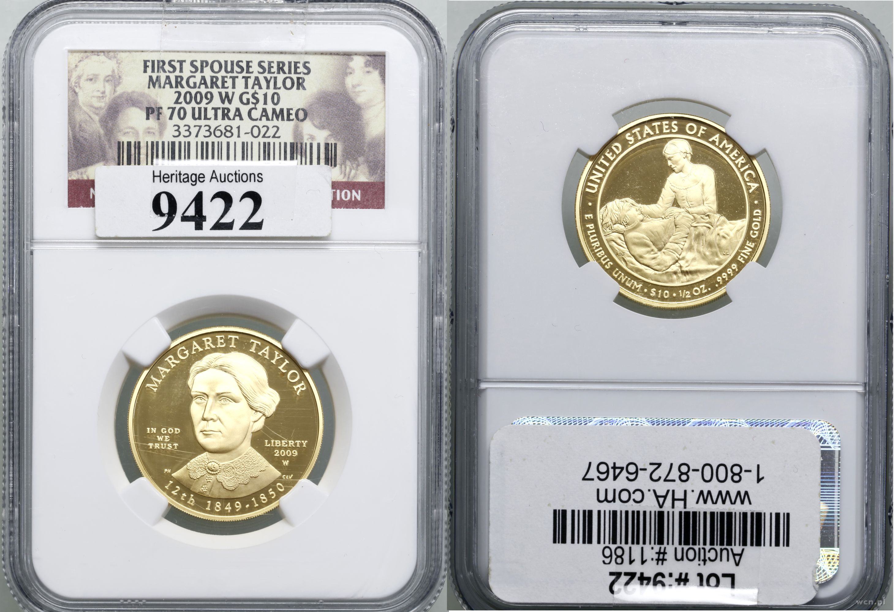 | Opis: | USA, 10 dolarów = 1/2 uncji 2009 W, West Point, First Spouse series - Margaret Taylor, stemple lustrzane, złoto ok. 15.55 g, próby 999.9, nakład 4.936 sztuki, idealnie zachowane, pudełko obklejone etykietą HeritageAuctions, w opakowaniu firmy NGC nr 3373681-022 z oceną PR70 ULTRACAMEO |