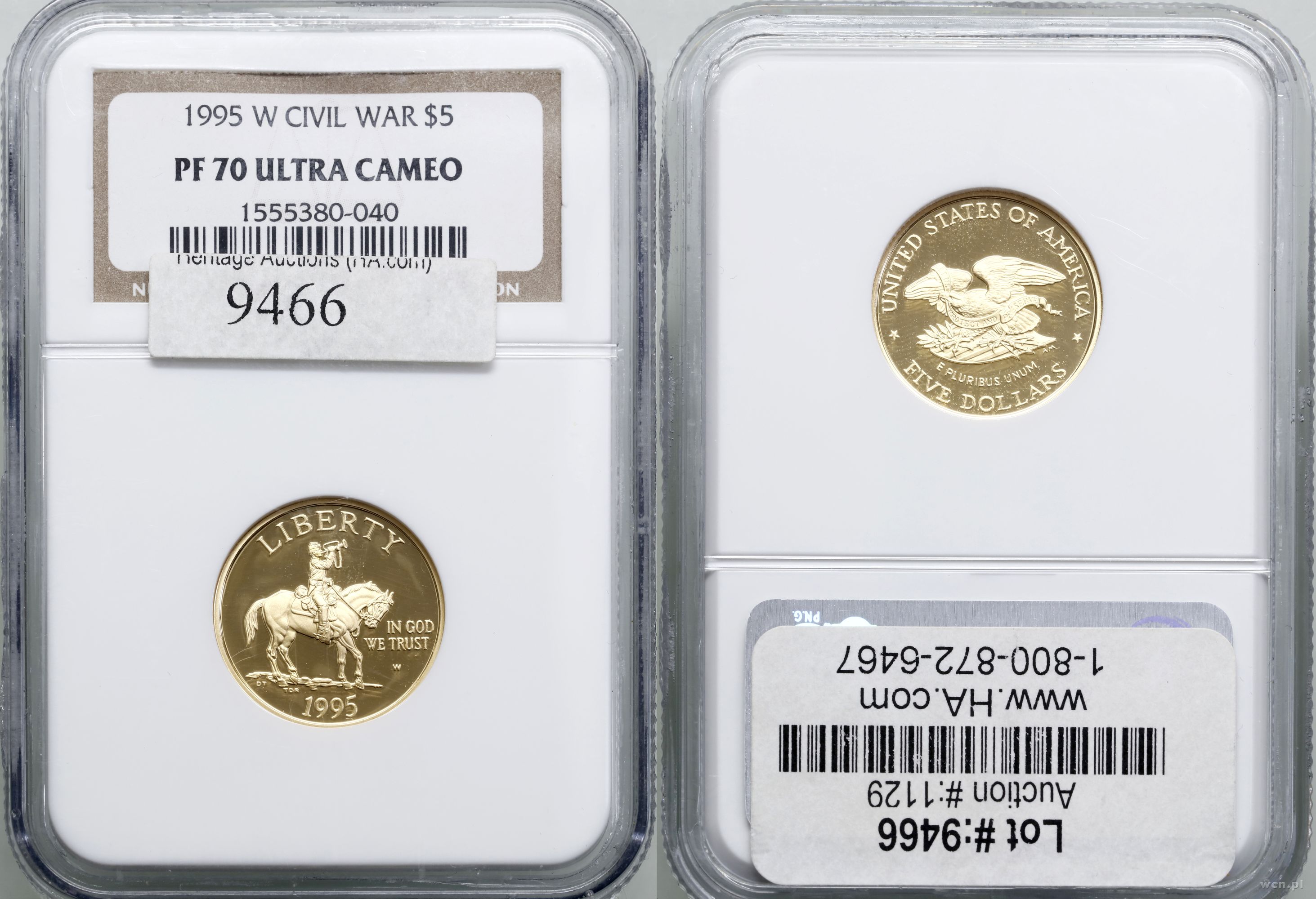 | Opis: | USA, 5 dolarów 1995 W, West Point, Bicentennial of end of Civil War, stemple lustrzane, złoto ok. 8.36 g, próby 900, nakład 55.246 sztuk, idealnie zachowane, pudełko obklejone etykietą HeritageAuctions, w opakowaniu firmy NGC nr 1555380-040 z oceną PR70 ULTRACAMEO |