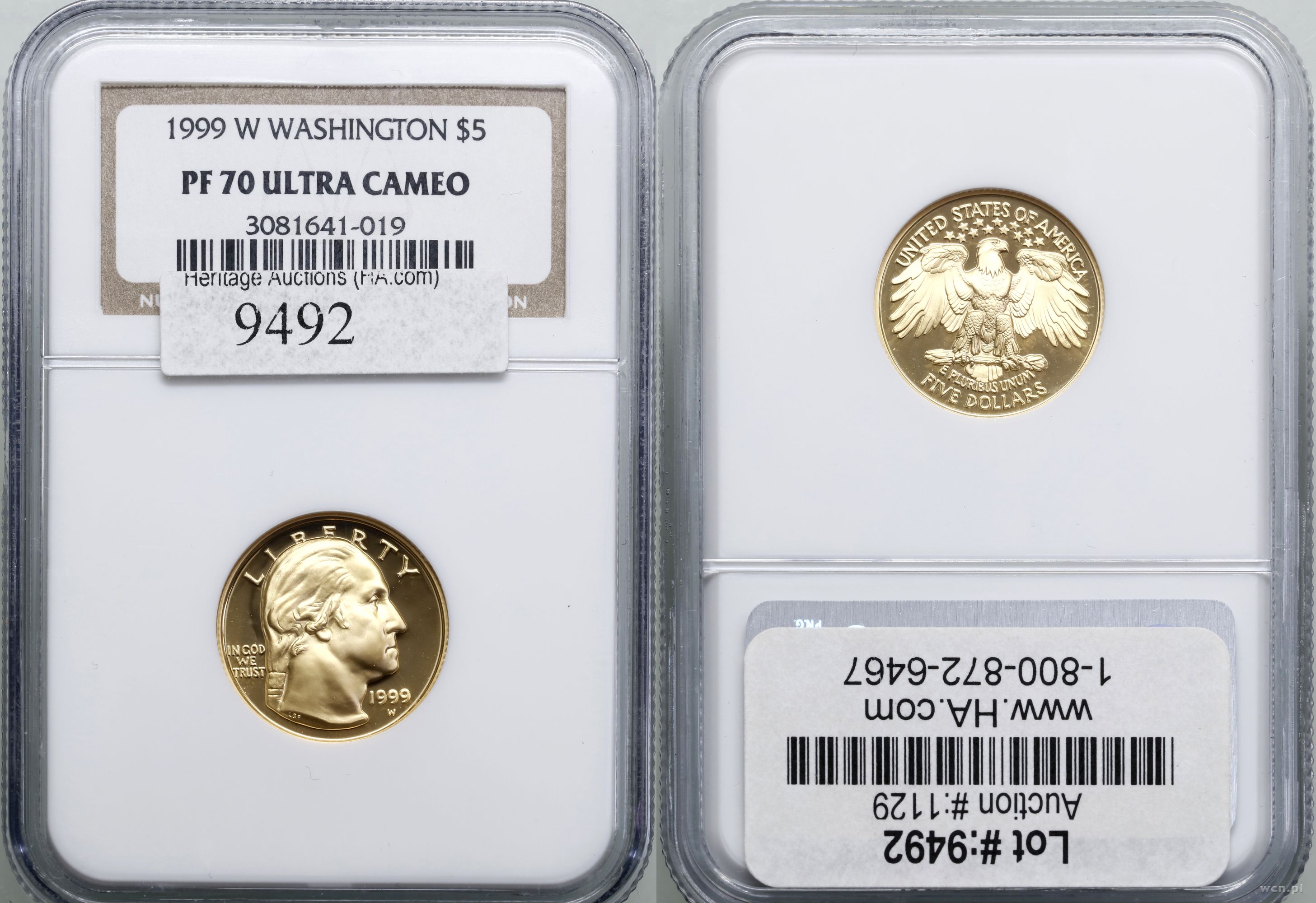 | Opis: | USA, 5 dolarów 1999 W, West Point, Bicentennial death of George Washington, stemple lustrzane, złoto ok. 8.36 g, próby 900, nakład: 41.693 szt., idealnie zachowane, pudełko obklejone etykietą HeritageAuctions, w opakowaniu firmy NGC nr 3081641-019 z oceną PR70 ULTRA CAMEO |