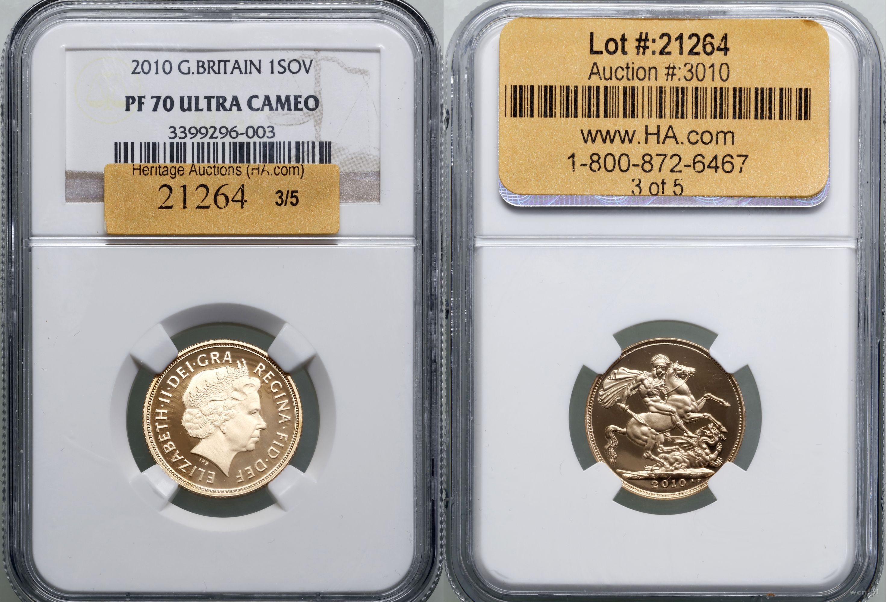 | Opis: | Europa, 1 funt (1 sovereign) 2010, Llantrisant, 4th portrait, stemple lustrzane, odmiana bez chusty na hełmie (no streamer), złoto ok. 7.99 g, próby 917, nakład: 8.828 szt., idealnie zachowane, pudełko obklejone etykietą HeritageAuctions, w opakowaniu firmy NGC nr 3399296-003 z oceną PR70 ULTRA CAMEO |