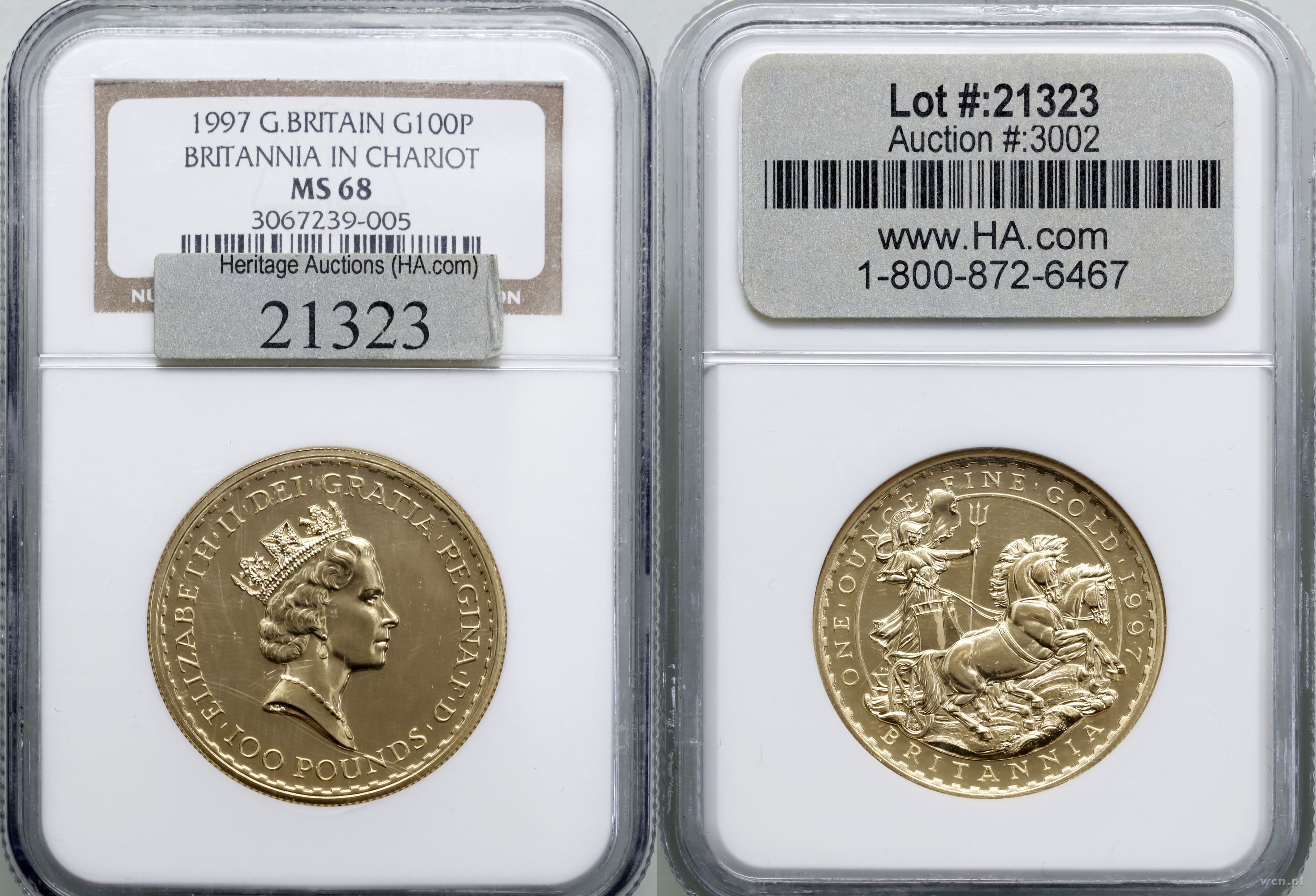 | Opis: | Europa, 100 funtów = 1 uncja 1997, Llantrisant, Britannia, stemple zwykłe, złoto ok. 34.05 g, próby 917, wyśmienicie zachowana, pudełko obklejone etykietą HeritageAuctions, w opakowaniu firmy NGC nr 3067239-005 z oceną MS68 |
