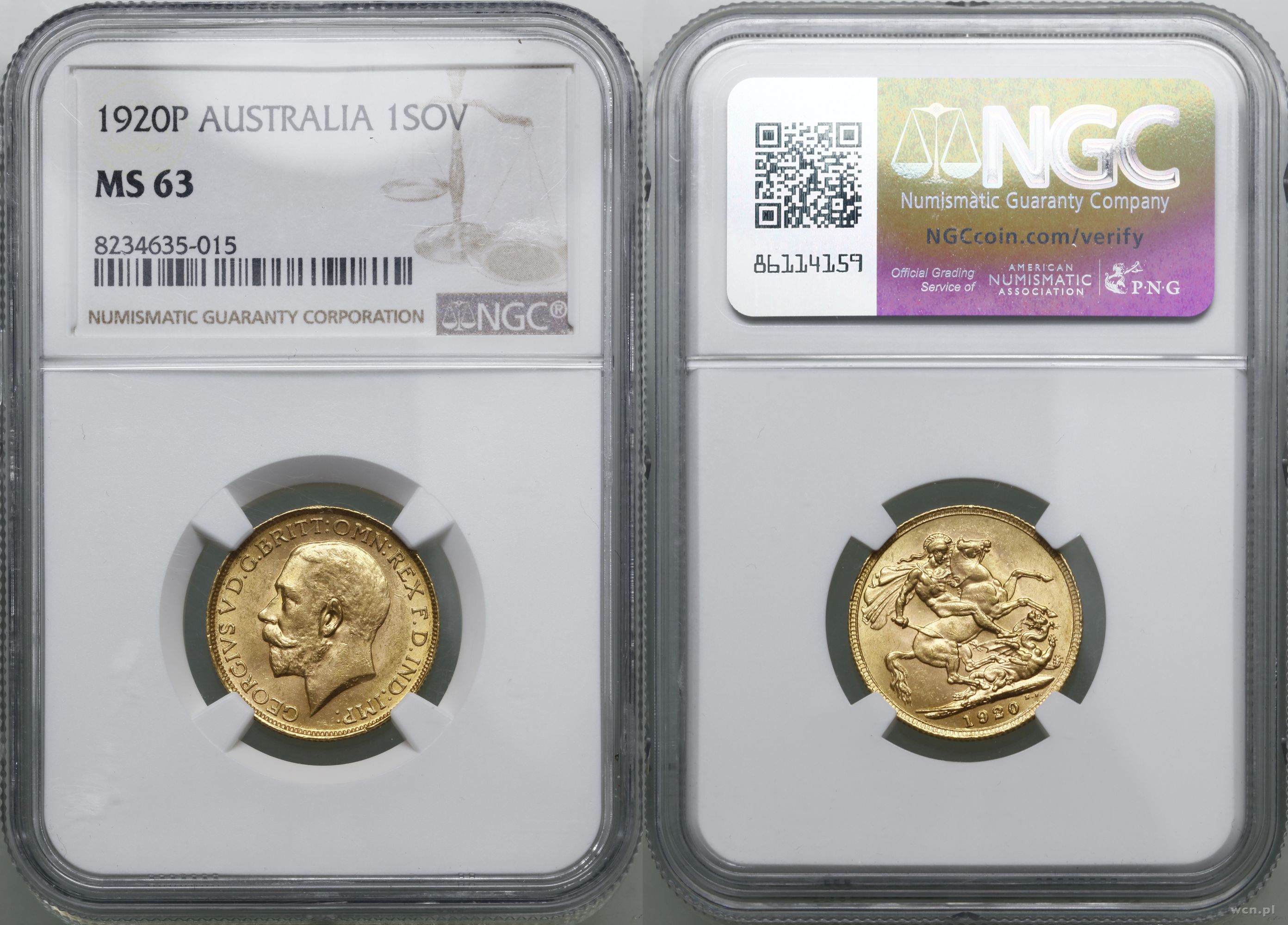 | Opis: | Europa, 1 funt (1 sovereign) 1920 P, Perth, złoto ok. 7.99 g, próby 916, nakład: 2.421.000 szt., pięknie zachowane, w opakowaniu firmy NGC nr 8234635-015 z oceną MS63 |
