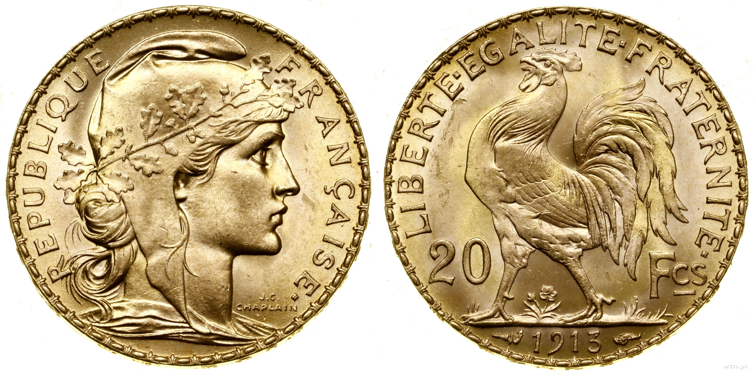 20 franków 1913, Paryż, typ Marianna, złoto 6.46 g, próby 900, nakład: 12.163.138 szt., uszkodzenia powierzchni rewersu |