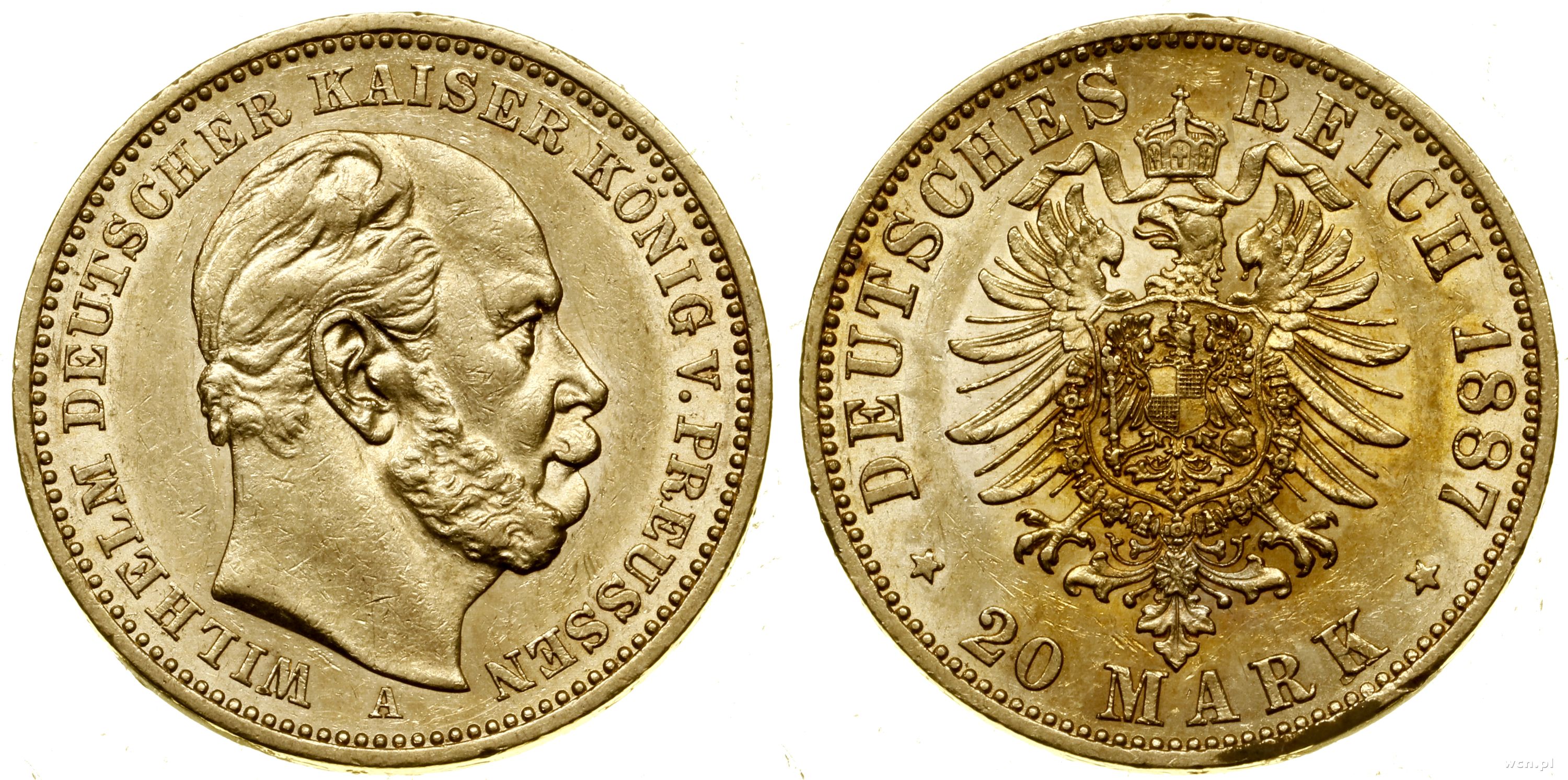 20 marek 1882 A, Berlin, data na końcu napisu na rewersie, złoto 7.93 g, próby 900, nakład: 655.102 szt. |