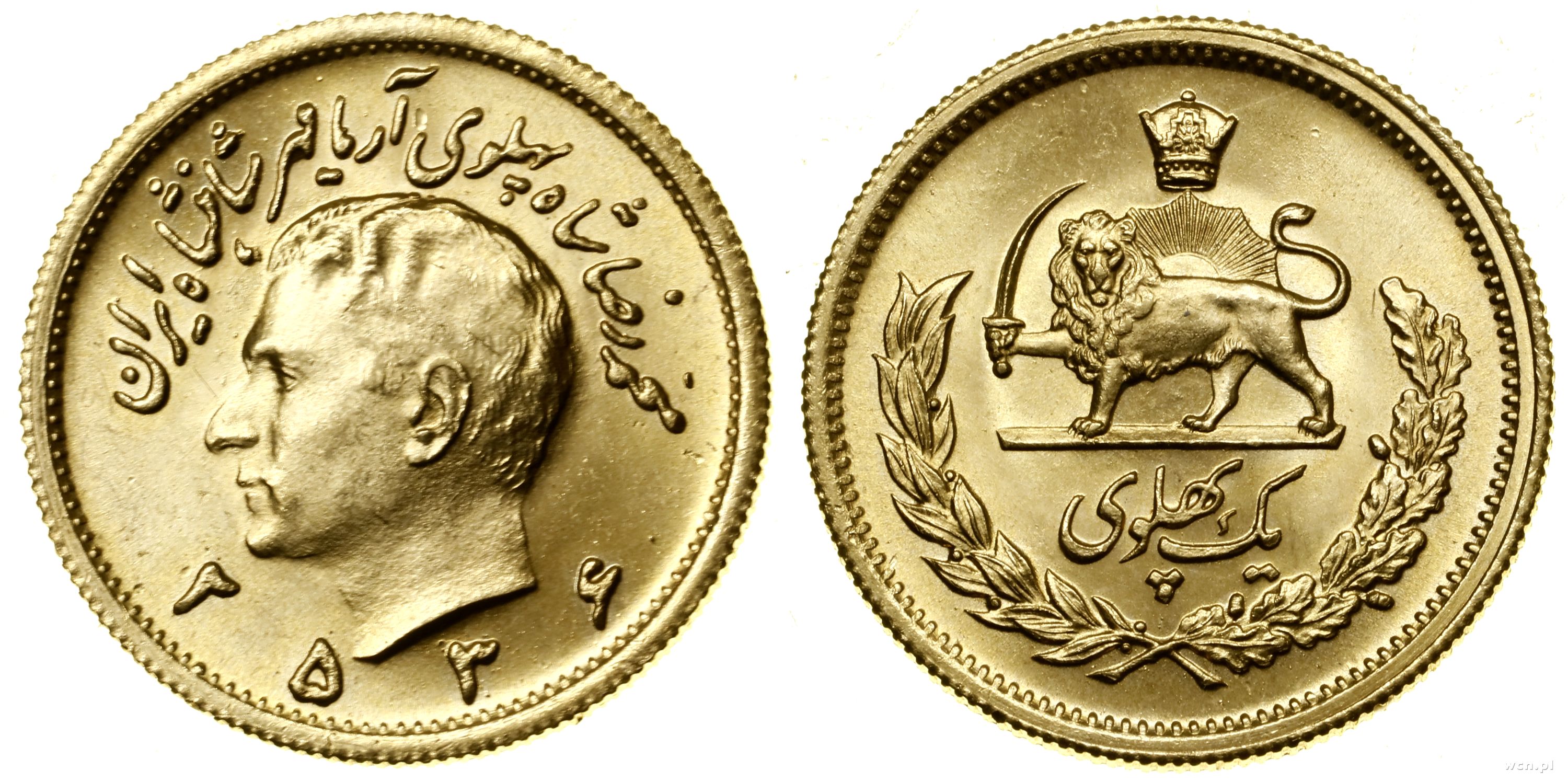 1 pahlavi 2536 MS (AD 1977), odmiana z dłuższą inskrypcją (Aryamehr) oraz datą "imperialną" (liczoną od założenia dynastii Achemenidów), złoto 8.14 g, próby 900, wyśmienicie zachowane |
