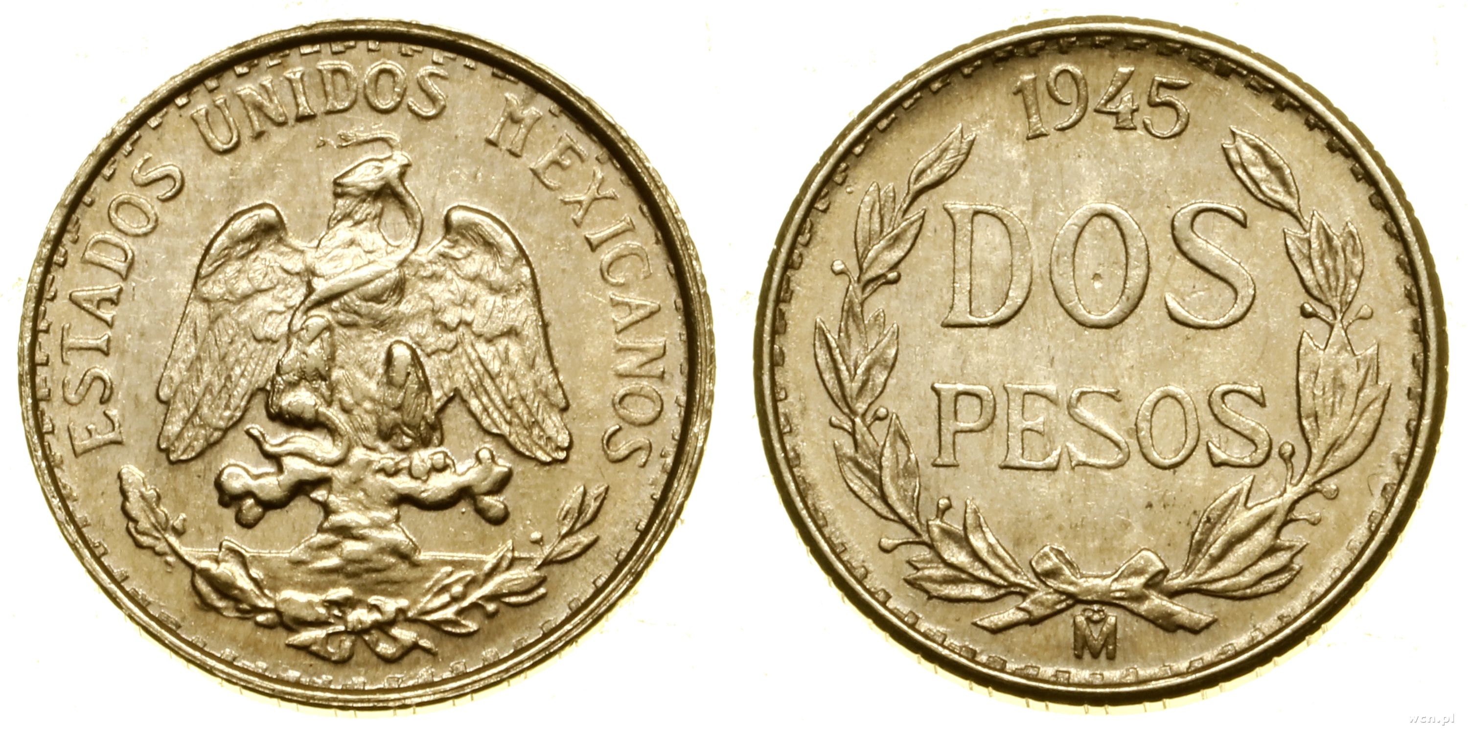 2 peso 1945, Meksyk, NOWE BICIE - RESTRIKE, złoto 1.66 g, próby 900, nakład: 4.590.493 szt., pięknie zachowane |