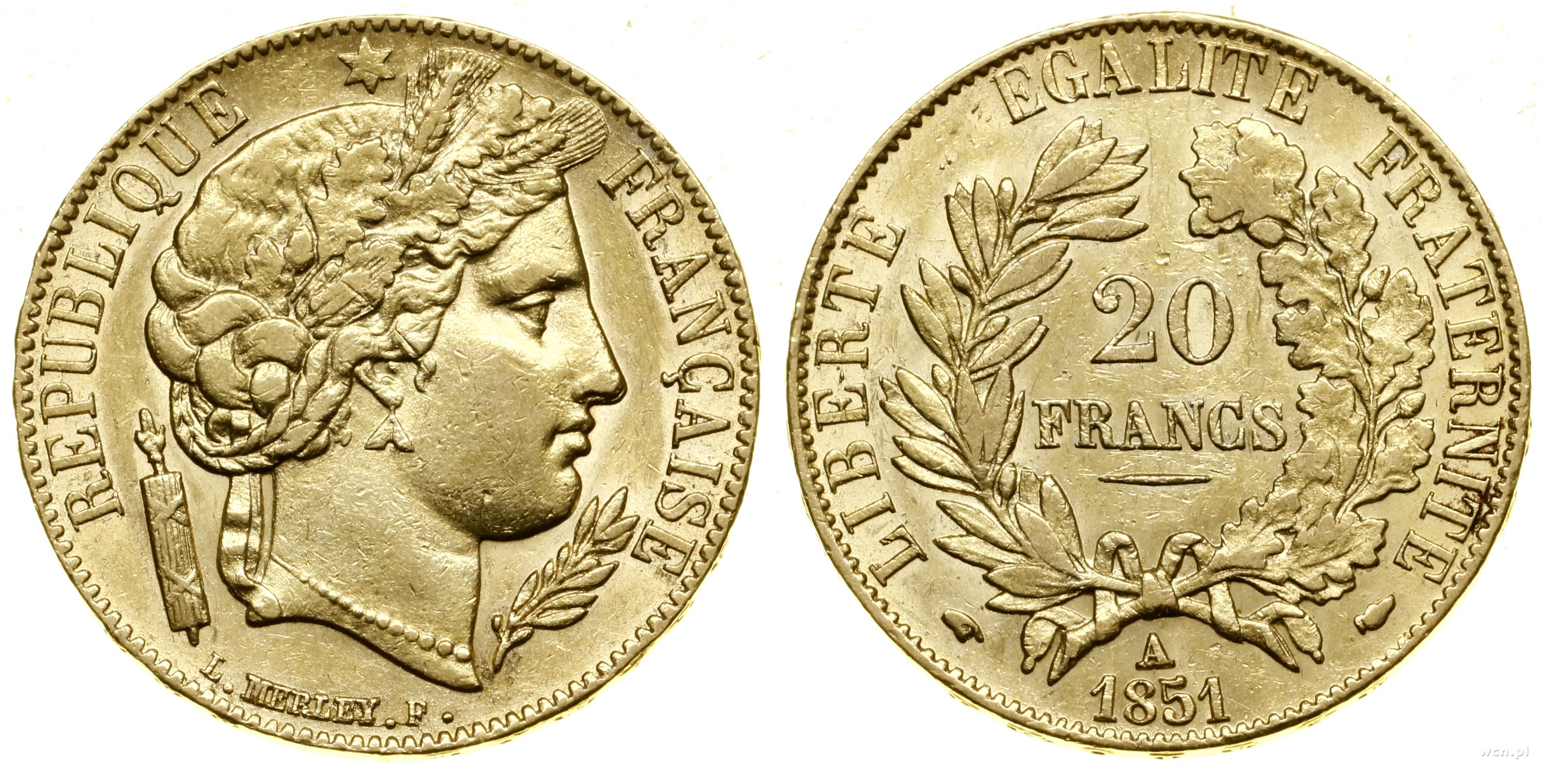 20 franków 1851 A, Paryż, głowa Ceres, złoto 6.41 g, próby 900, nakład: 12.704.000 szt. |