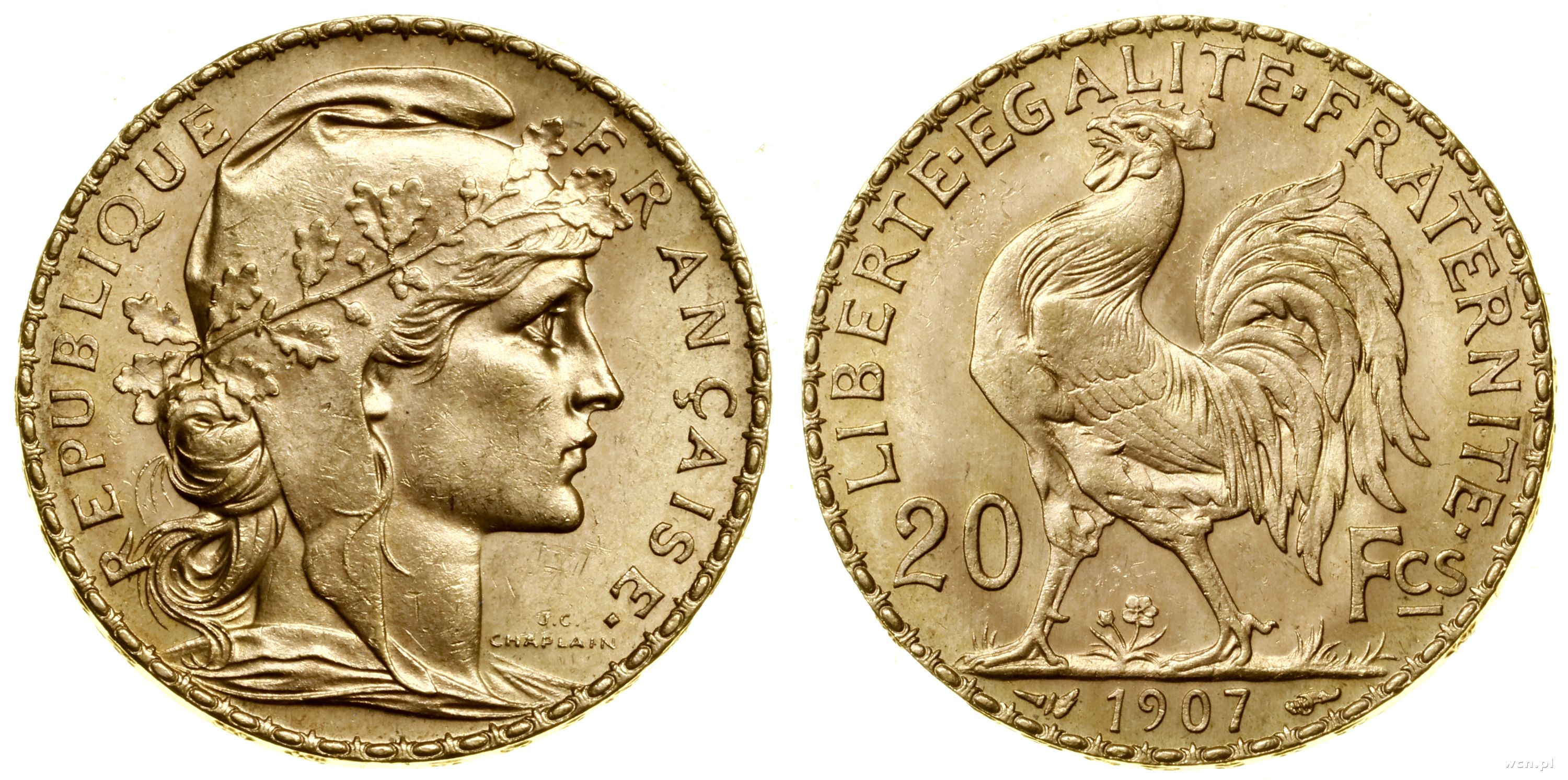 20 franków 1907, Paryż, typ Marianna, złoto 6.45 g, próby 900, nakład: 17.715.935 szt., wyśmienite |