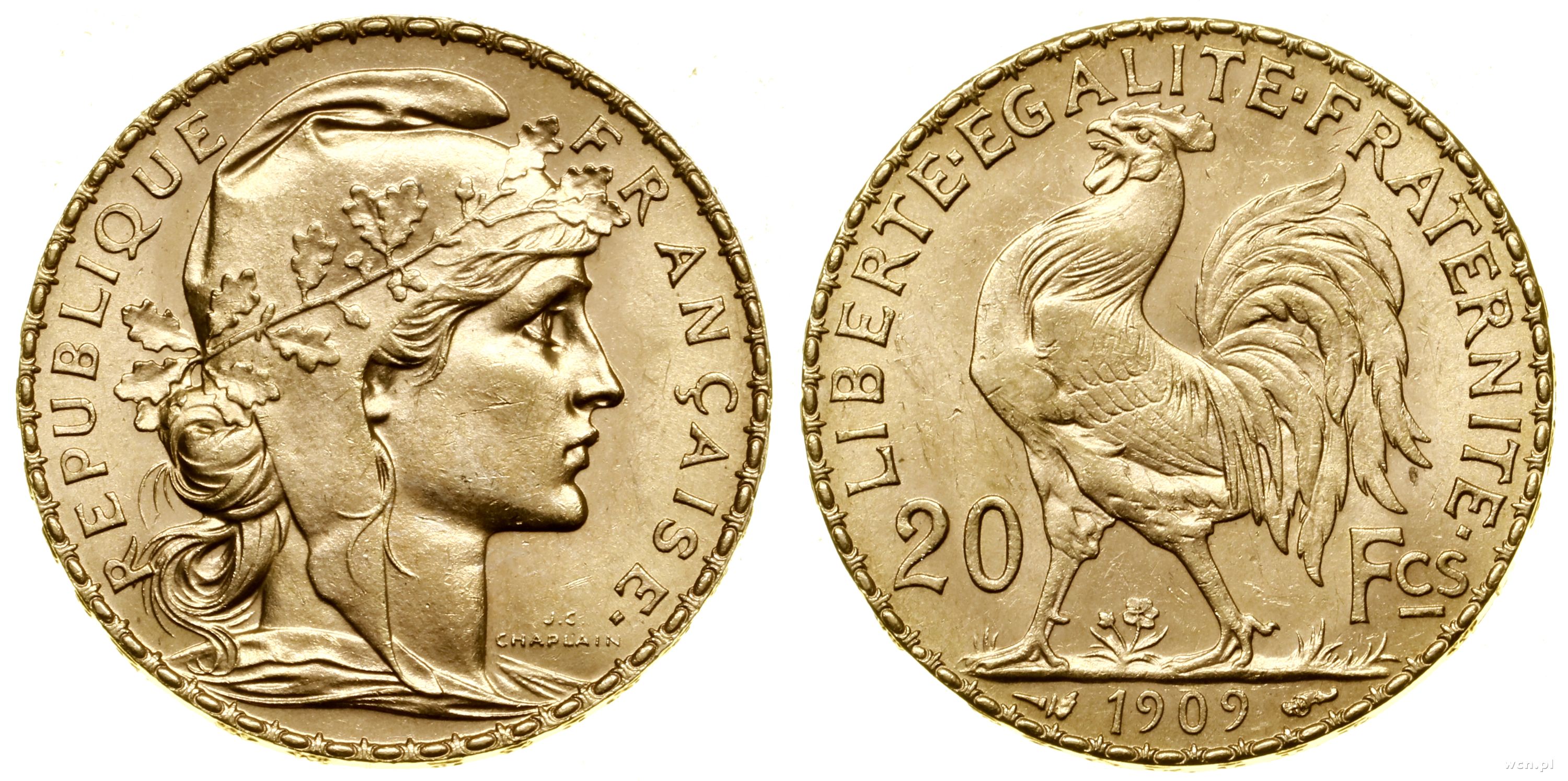 20 franków 1909, Paryż, typ Marianna, złoto 6.45 g, próby 900, nakład: 9.636.955 szt., wyśmienite |