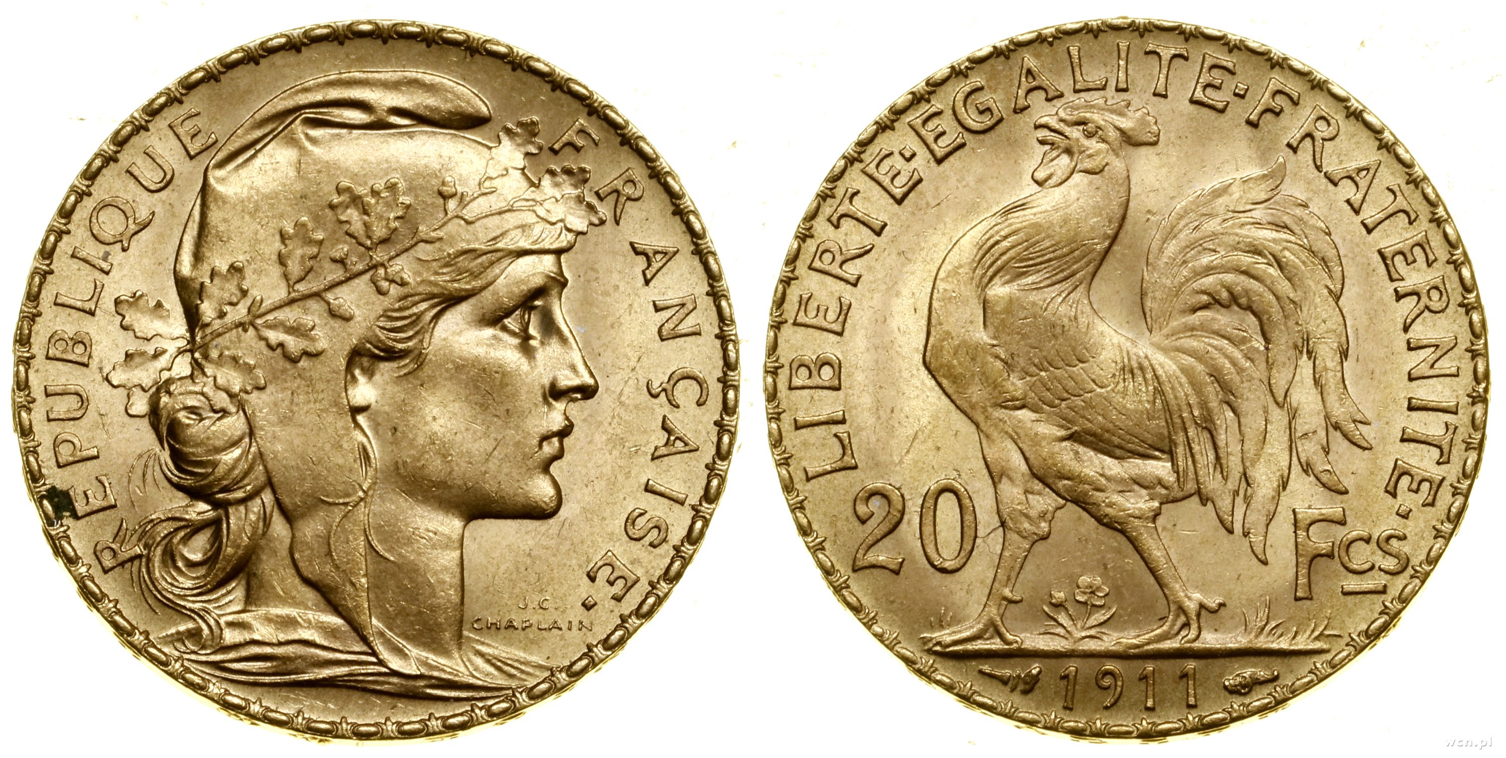 20 franków 1911, Paryż, typ Marianna, złoto 6.45 g, próby 900, nakład: 5.346.044 szt., wyśmienite |