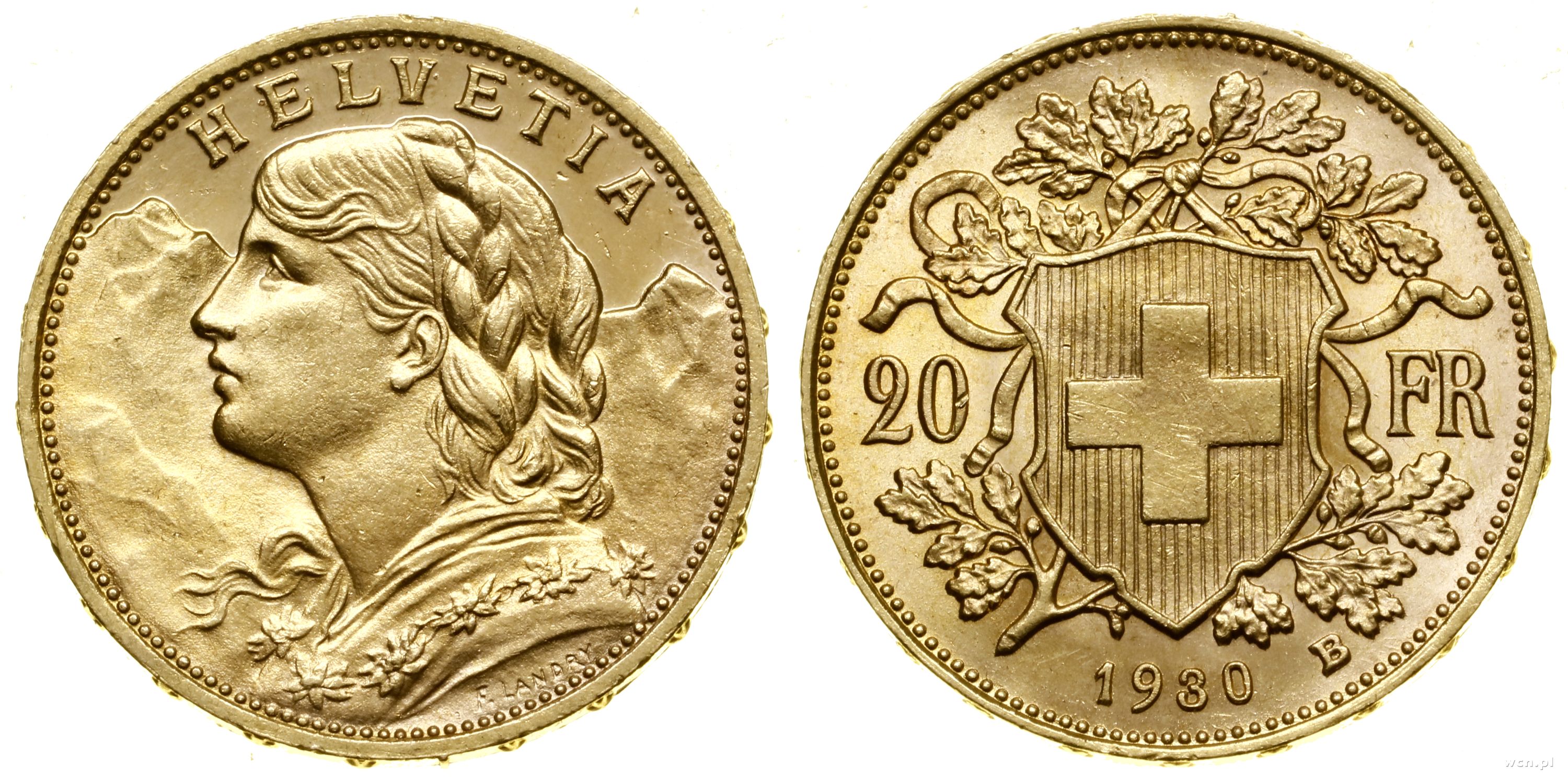 20 franków 1930 B, Berno, typ Vreneli, złoto 6.45 g, próby 900, nakład: 3.371.764 szt., wyśmienite |