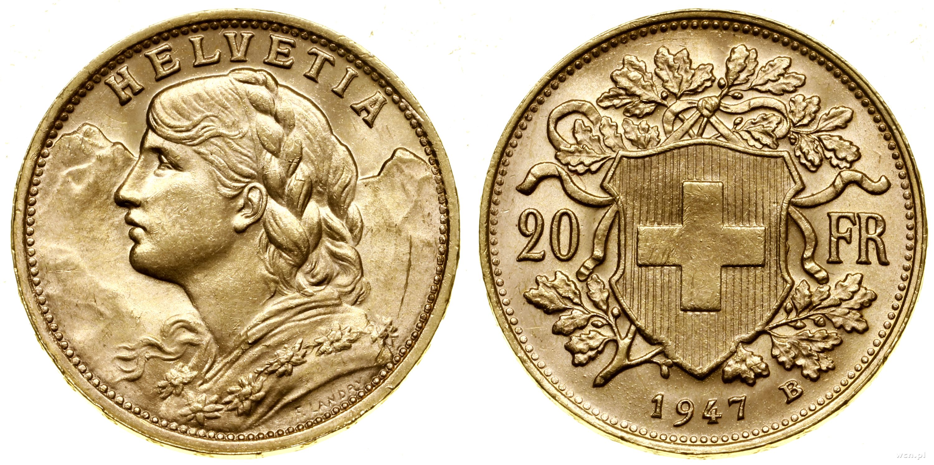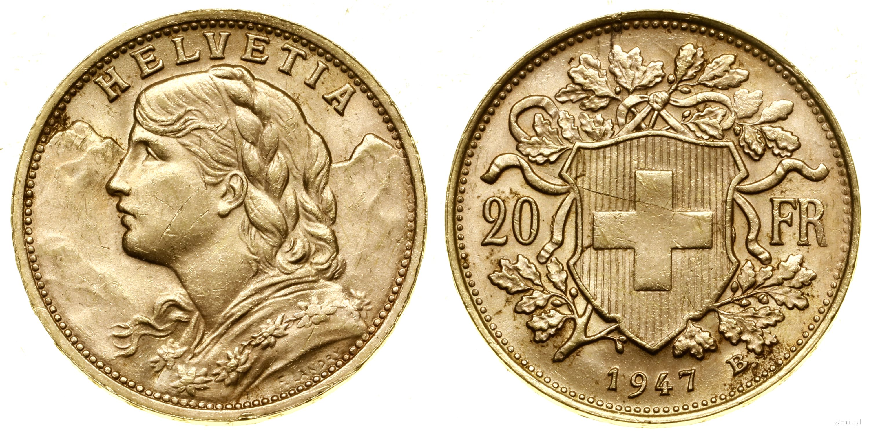 20 franków 1947 B, Berno, typ Vreneli, złoto 6.44 g, próby 900, nakład: 9.200.000 szt., wada krążka na rewersie, pięknie zachowane |