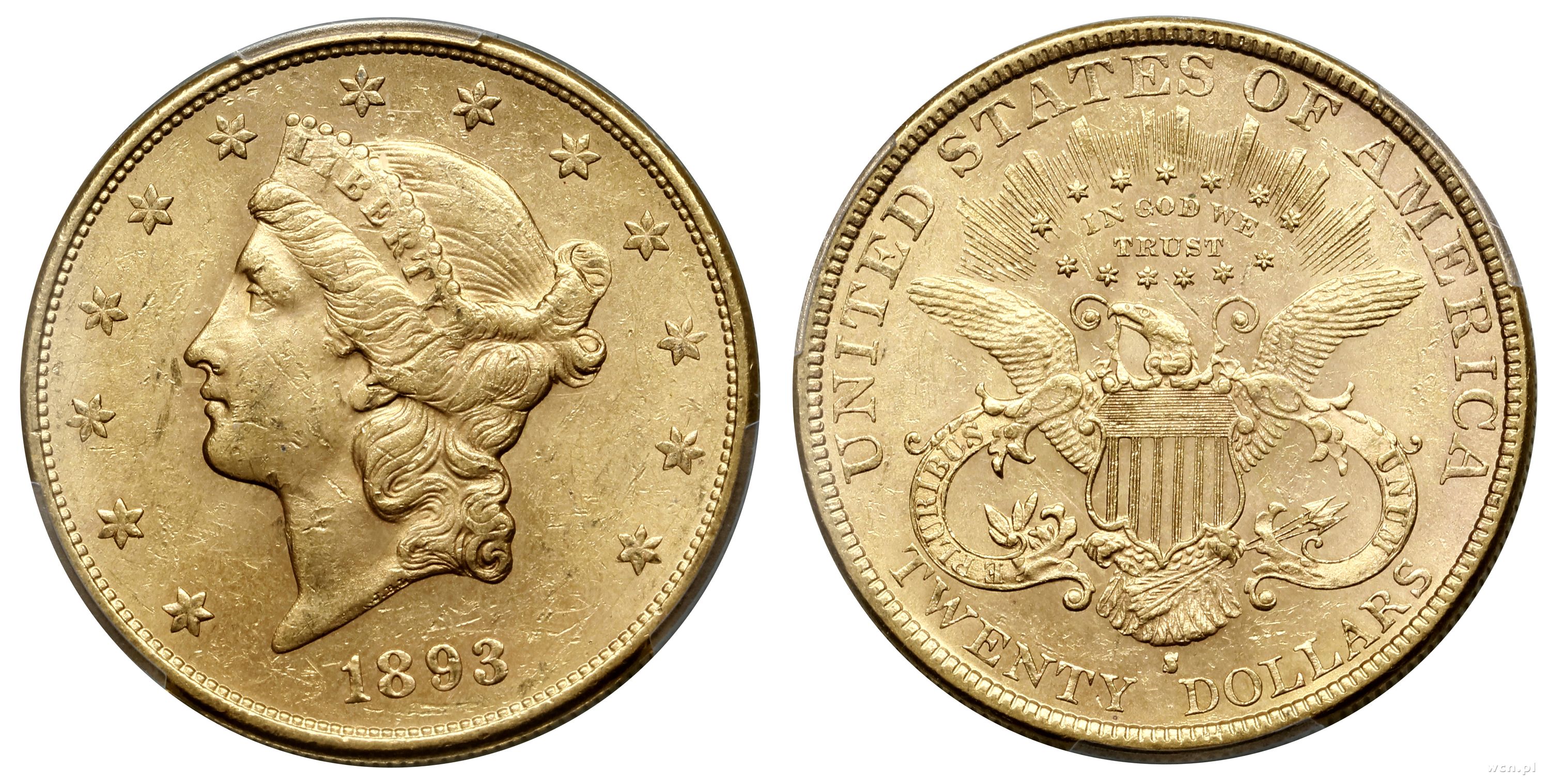 20 dolarów 1893 S, San Francisco, typ Liberty Head, z motto na rewersie i TWENTY DOLLARS, złoto ok. 33.43 g, próby 900, nakład: 996.175 szt., pięknie zachowane, w opakowaniu firmy PCGS nr 9024.61/51220159 z oce.. |