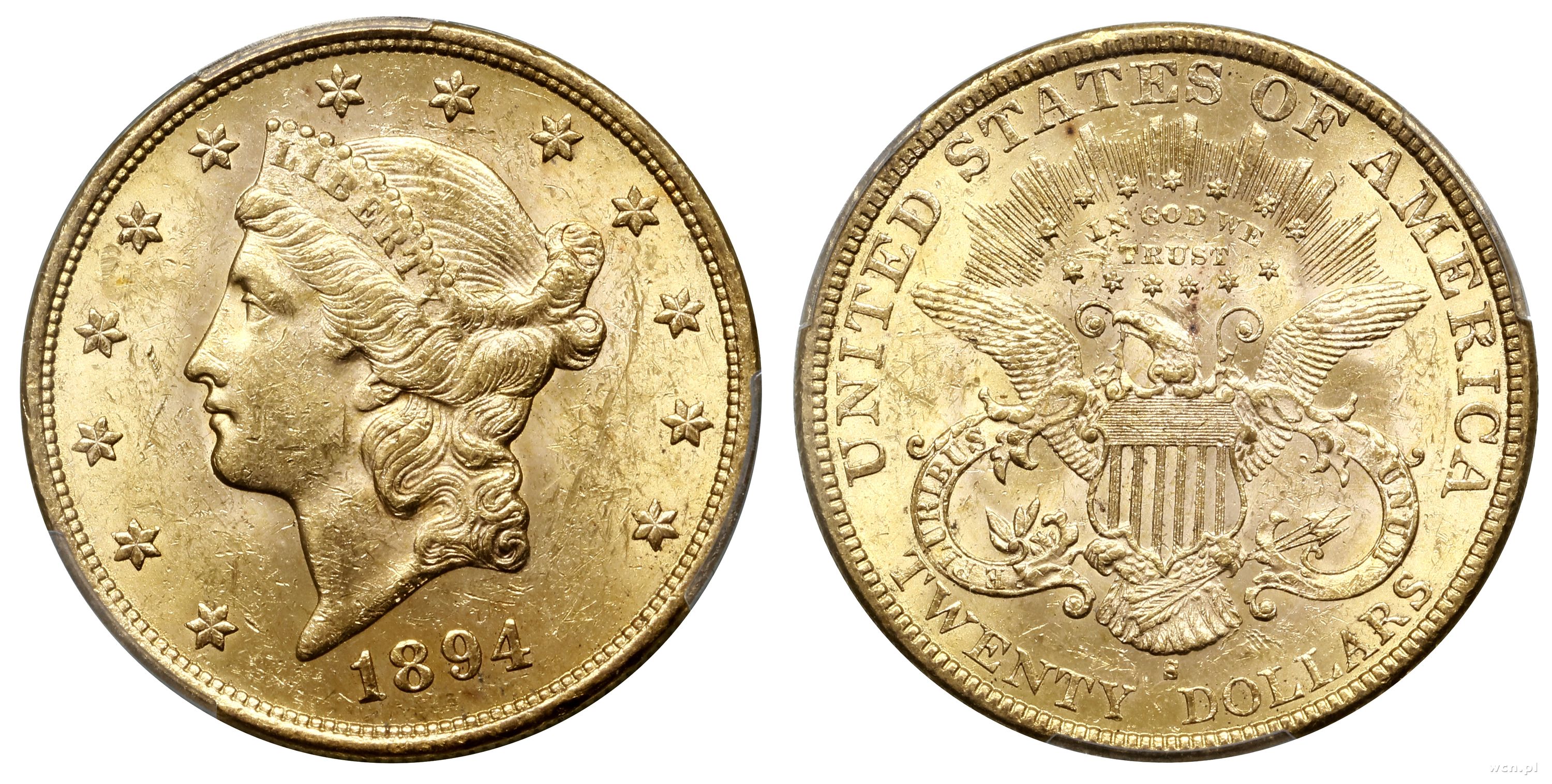 20 dolarów 1894 S, San Francisco, typ Liberty Head, z motto na rewersie i TWENTY DOLLARS, złoto ok. 33.43 g, próby 900, nakład: 1.048.550 szt., pięknie zachowane, w opakowaniu firmy PCGS nr 9026.61/51086636 z o.. |