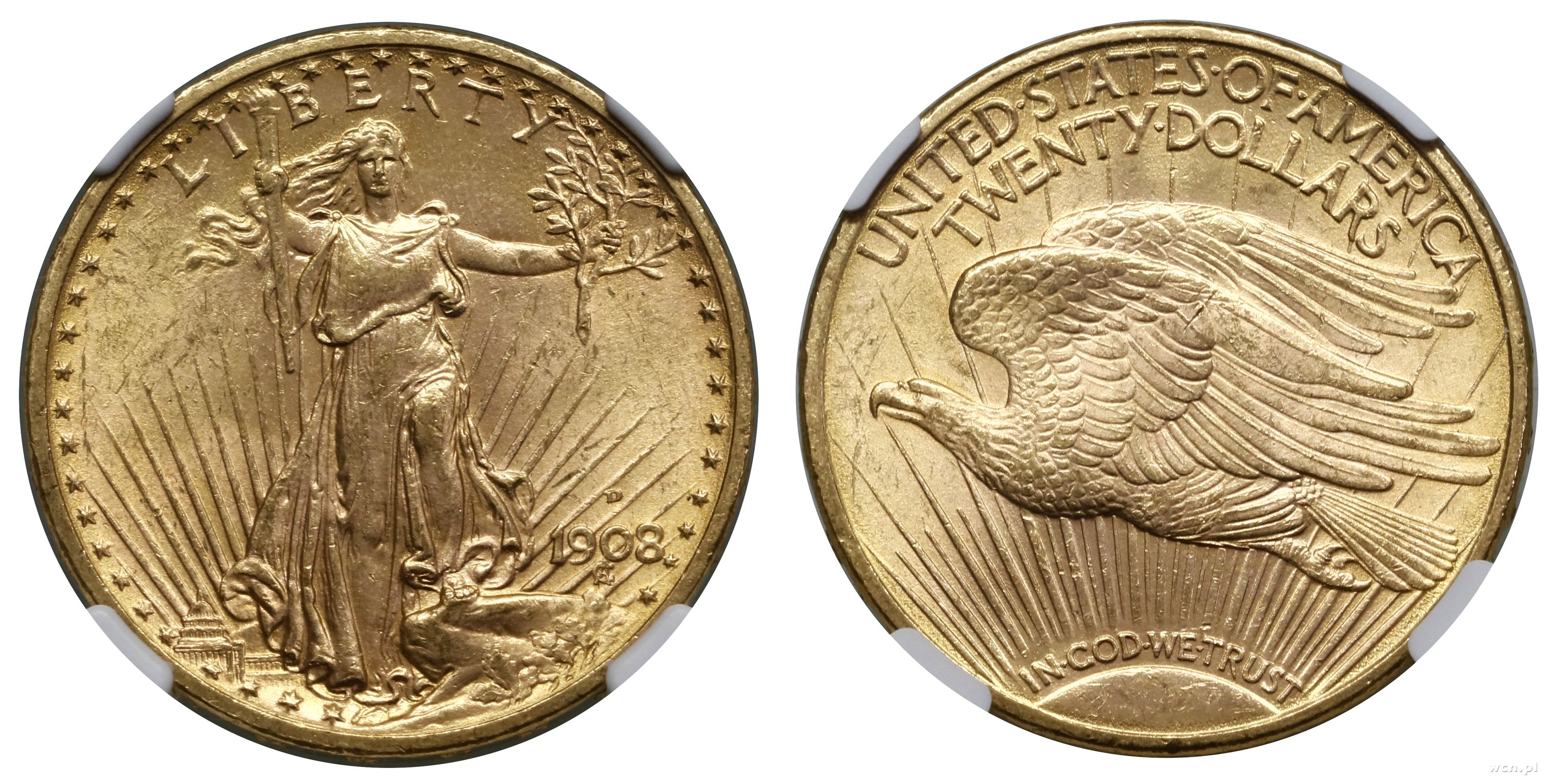 20 dolarów 1908 D, Denver, typ Saint Gaudens, z motto na rewersie, złoto ok. 33.43 g, próby 900, nakład: 349.500 szt., pięknie zachowane, w opakowaniu firmy NGC nr 5882723-009 z oceną MS63 |