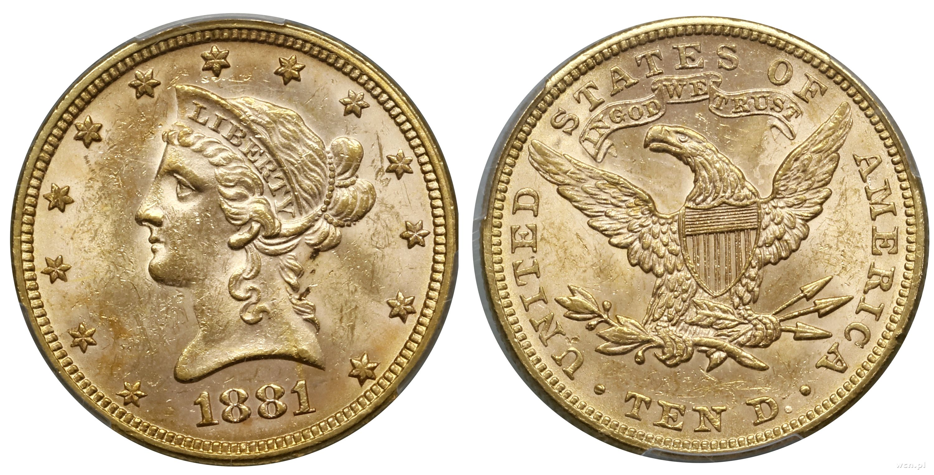 10 dolarów 1881, Filadelfia, typ Liberty head with Coronet / Eagle with motto, złoto ok. 16.72 g, próby 900, nakład: 3.877.220 szt., pięknie zachowane, w opakowaniu firmy PCGS nr 8691.62/48428034