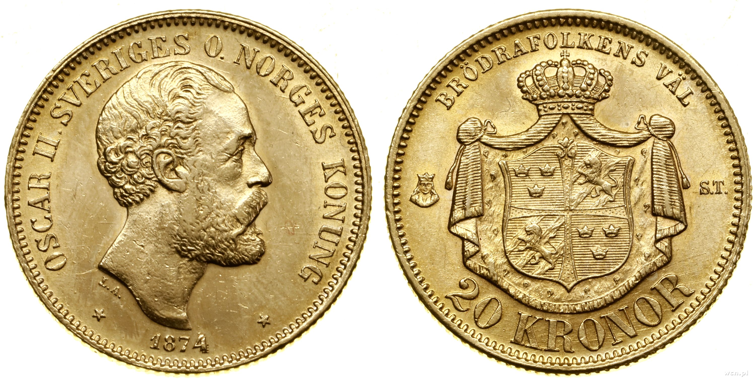 20 koron 1874 ST, Stockholm, młoda głowa / bez tarczy sercowej na tarczy herbowej, złoto 8.94 g, próby 900, nakład: 240.000 szt. |