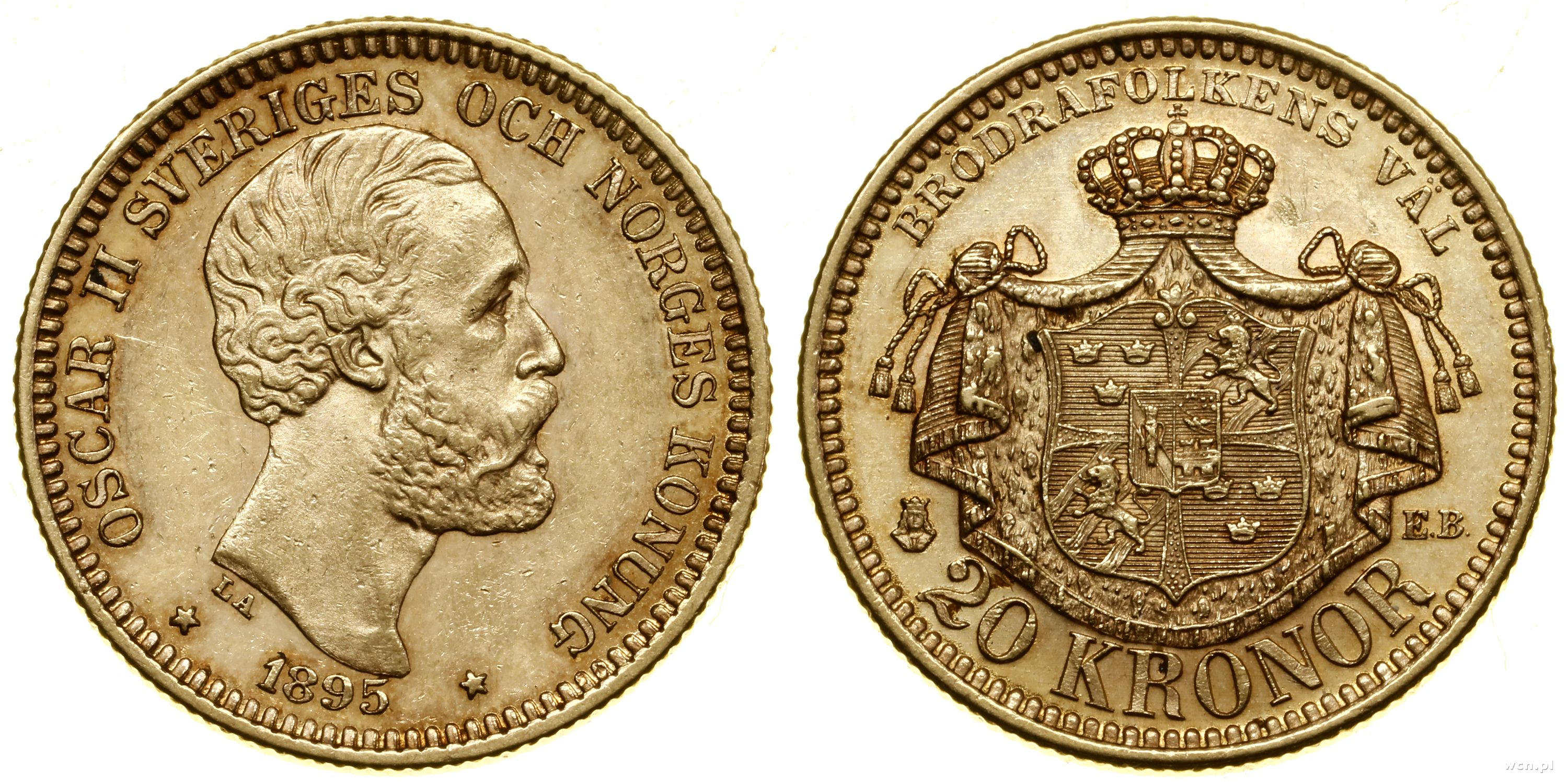 20 koron 1895 EB, Stockholm, młoda głowa / z tarczą sercową na tarczy herbowej, złoto 8.97 g, próby 900, nakład: 135.000 szt. |