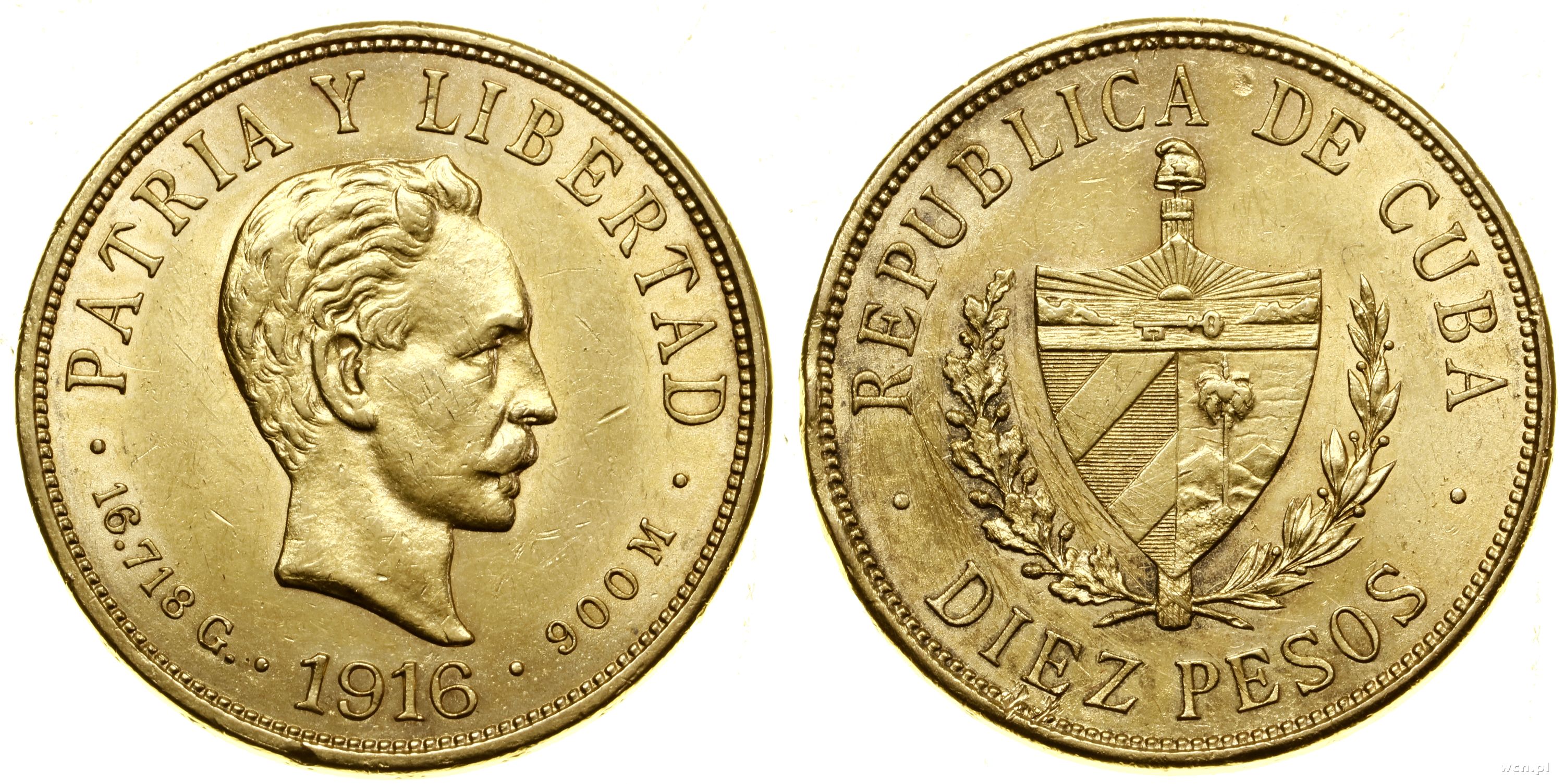 10 peso 1916, Filadelfia, złoto 16.71 g, próby 900, nakład: 1.169.000 szt., niewielkie uderzenia na rancie, lekko przetarte |