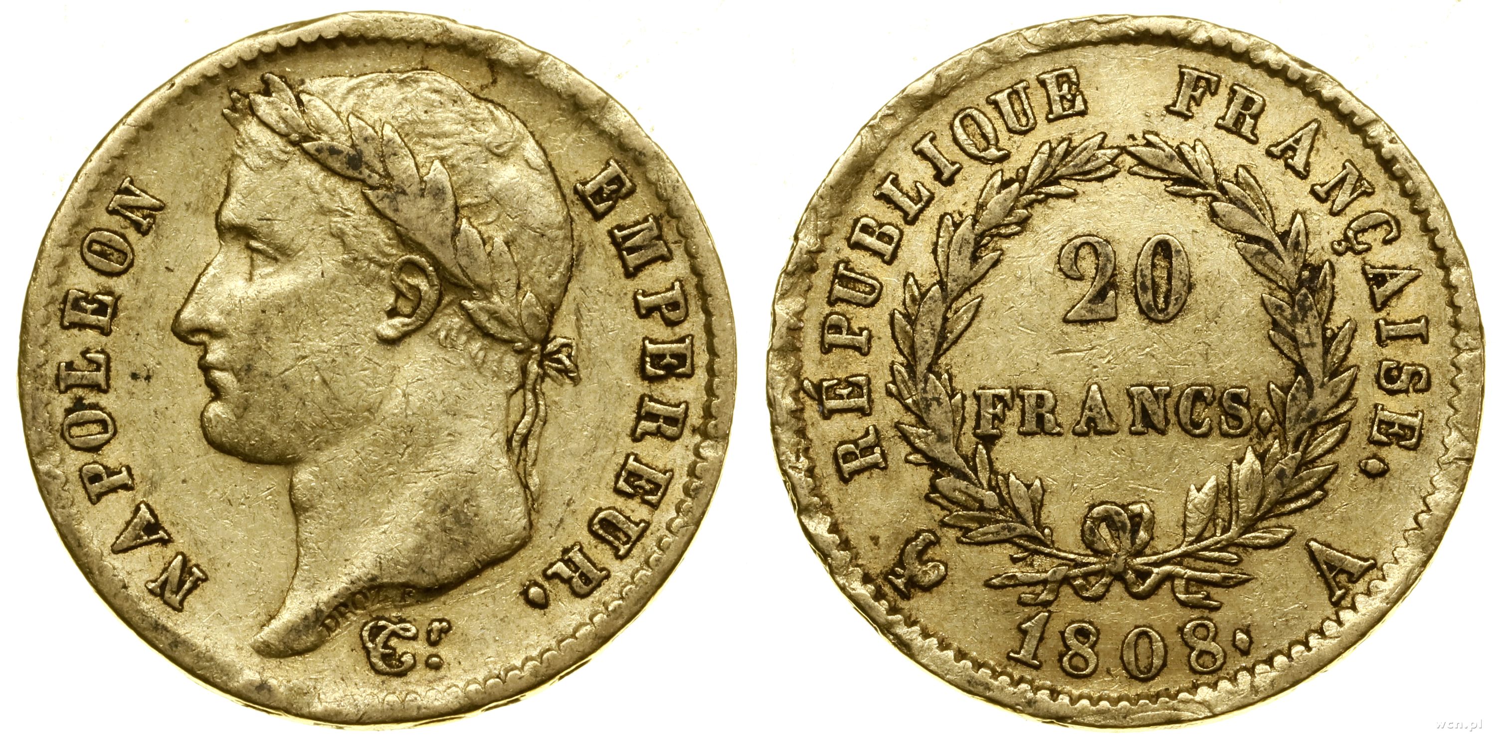 20 franków 1808 A, Paryż, głowa w wieńcu laurowym, na rewersie REPUBLIQUE ..., złoto 6.41 g, próby 900, nakład: 1.449.781 szt. |