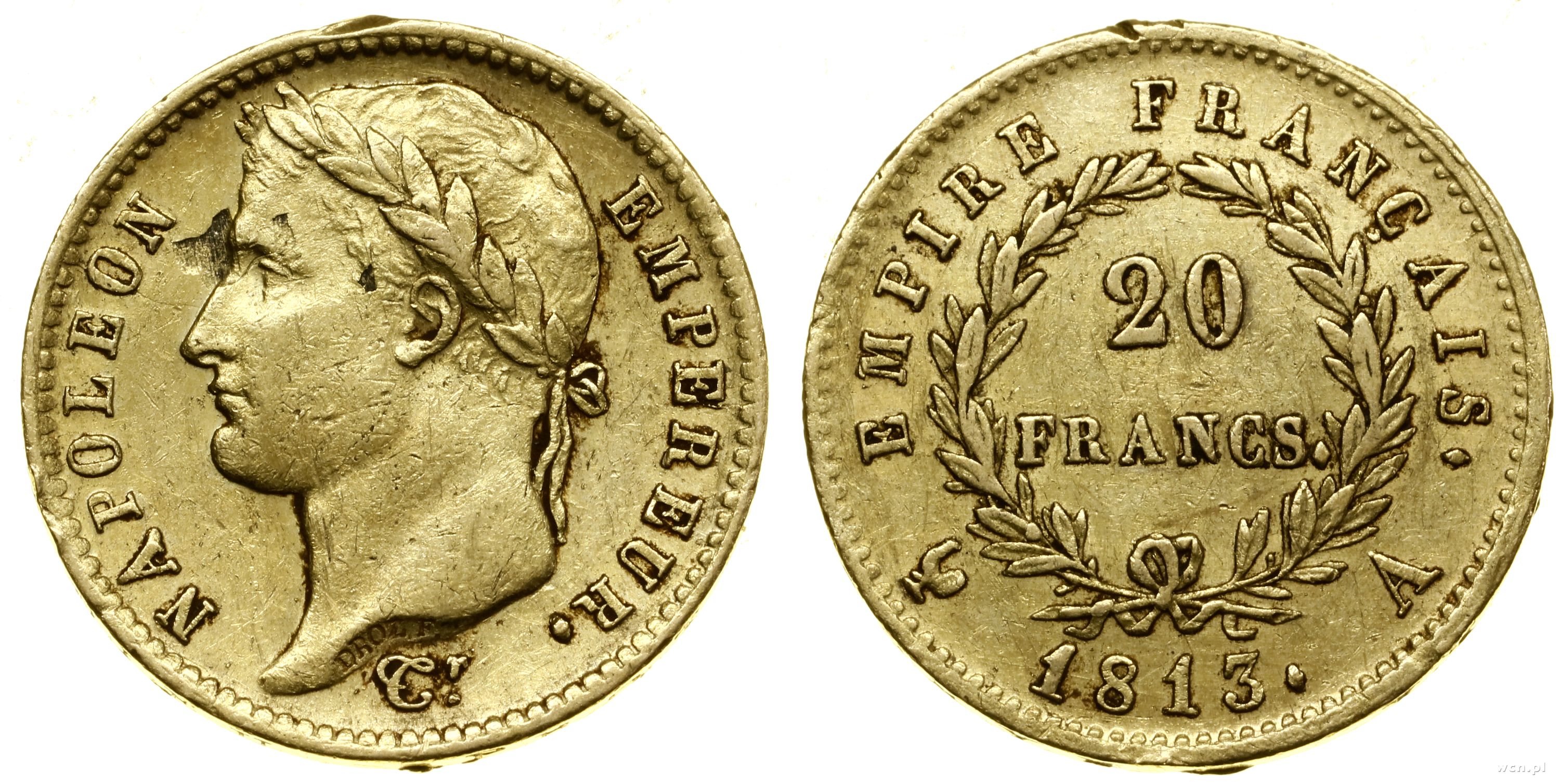 20 franków 1813 A, Paryż, głowa w wieńcu laurowym, na rewersie EMPIRE ..., złoto 6.41 g, próby 900, nakład: 2.798.409 szt. |