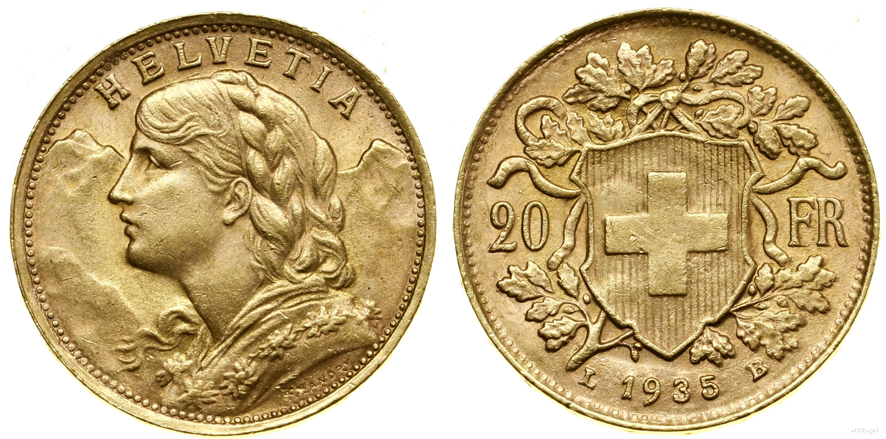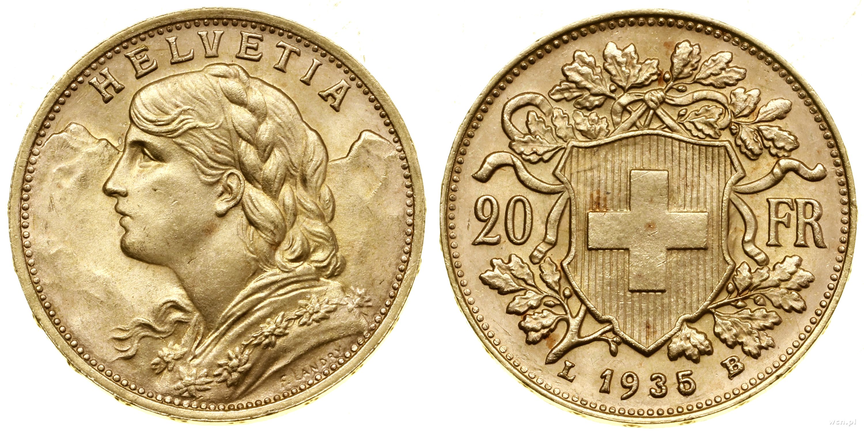 20 franków 1935 L-B, Berno, typ Vreneli, złoto 6.44 g, próby 900, nakład: 20.008.813 szt. |