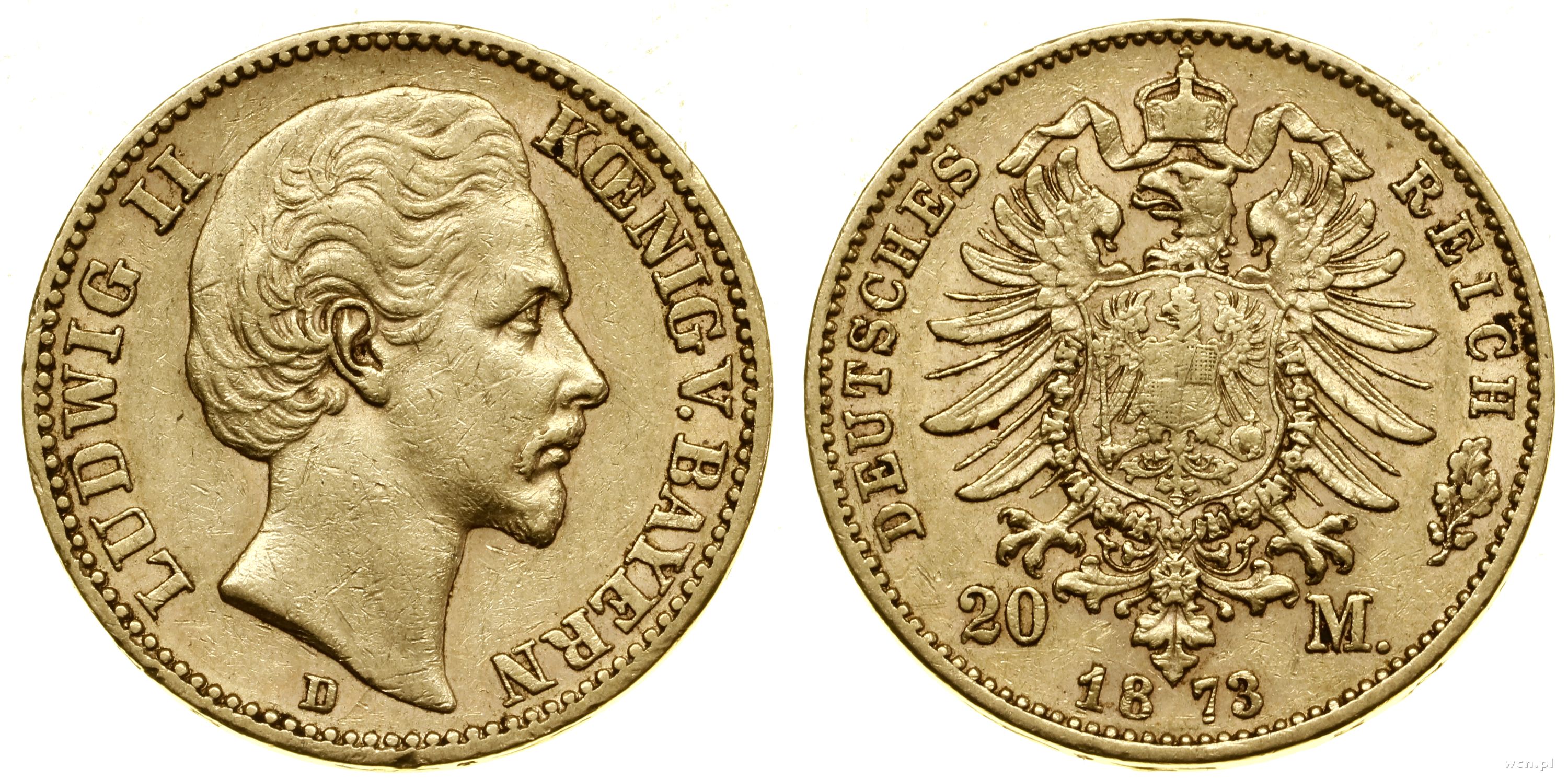 20 marek 1873 D, Monachium, złoto 7.93 g, próby 900, nakład: 2.770.067 szt., przetarte |