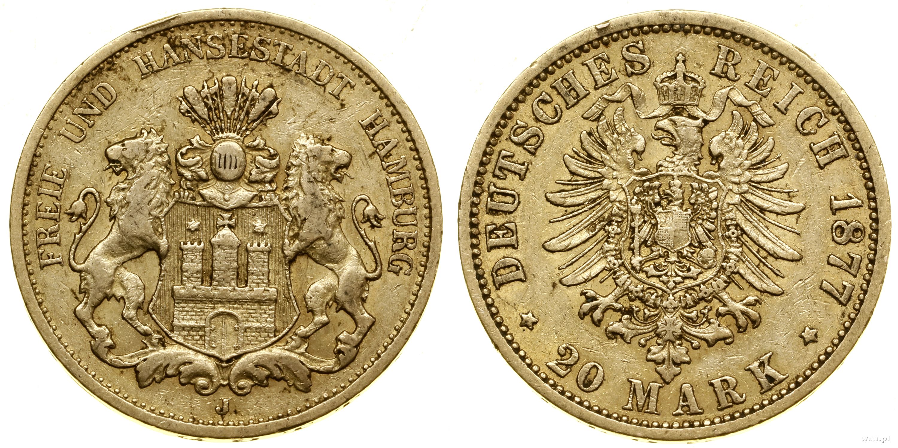 20 marek 1877 J, Hamburg, złoto 7.90 g, próby 900, nakład: 1.324.286 szt. |