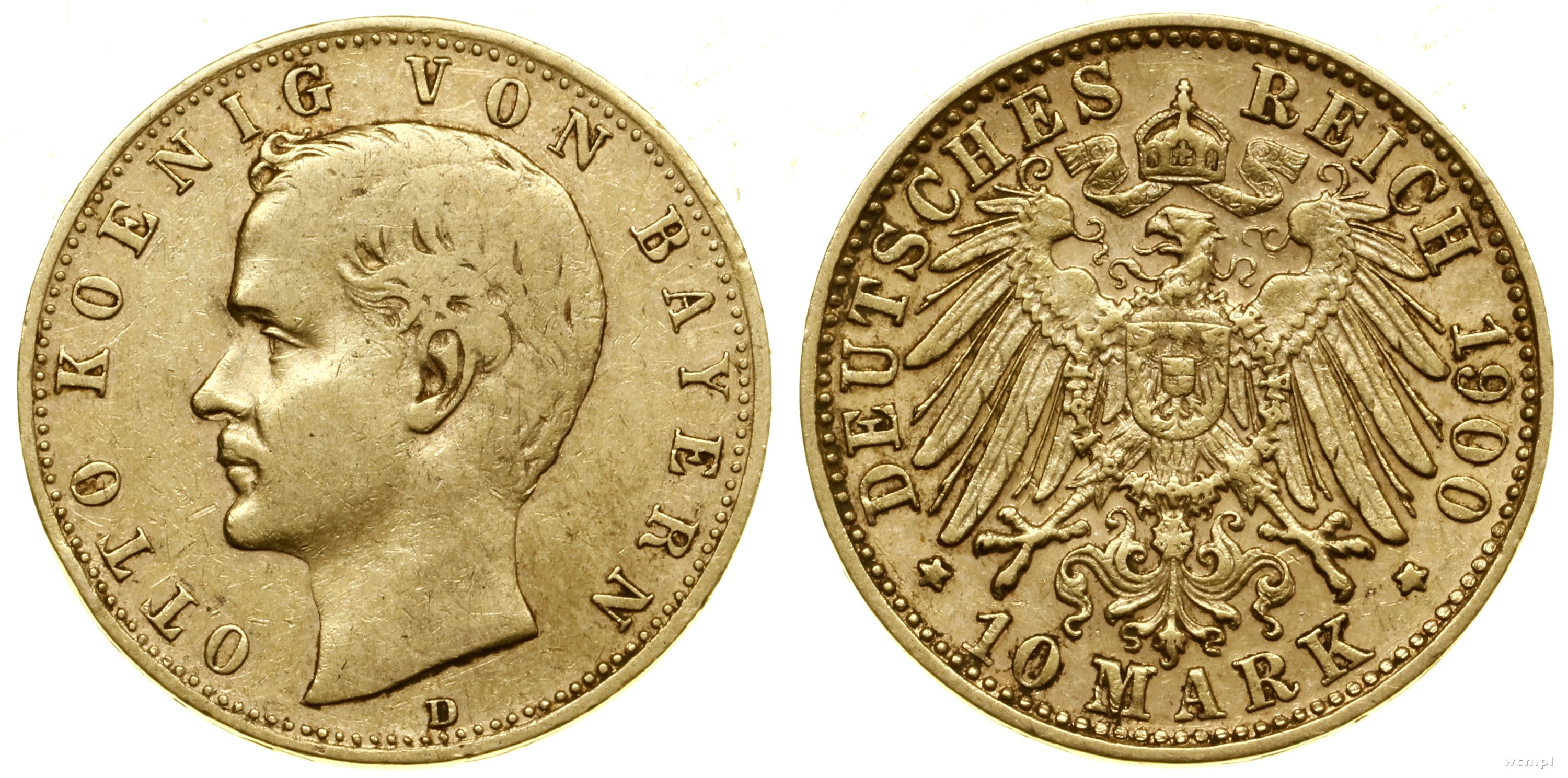 10 marek 1900 D, Monachium, odmiana starsza z napisem nierozdzielonym głową króla, złoto 3.96 g, próby 900, nakład: 140.798 szt., wytarte |