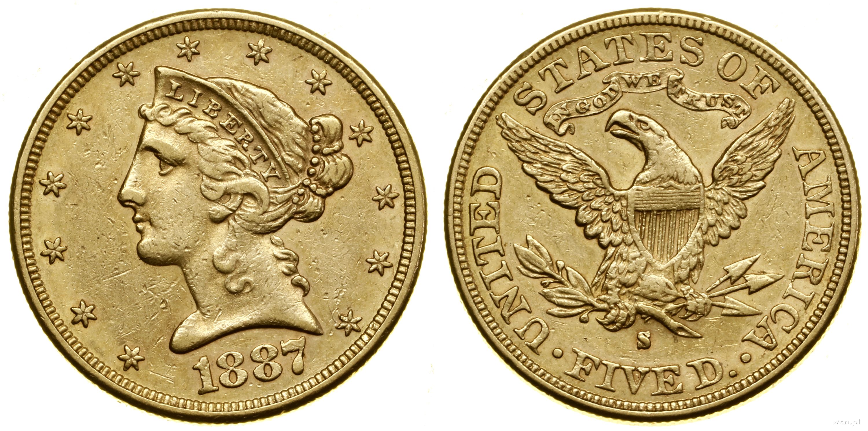 5 dolarów 1887 S, San Francisco, typ Liberty with Coronet, motto above Eagle, złoto 8.34 g, próby 900, nakład: 1.912.000 szt., lekko przetarte |