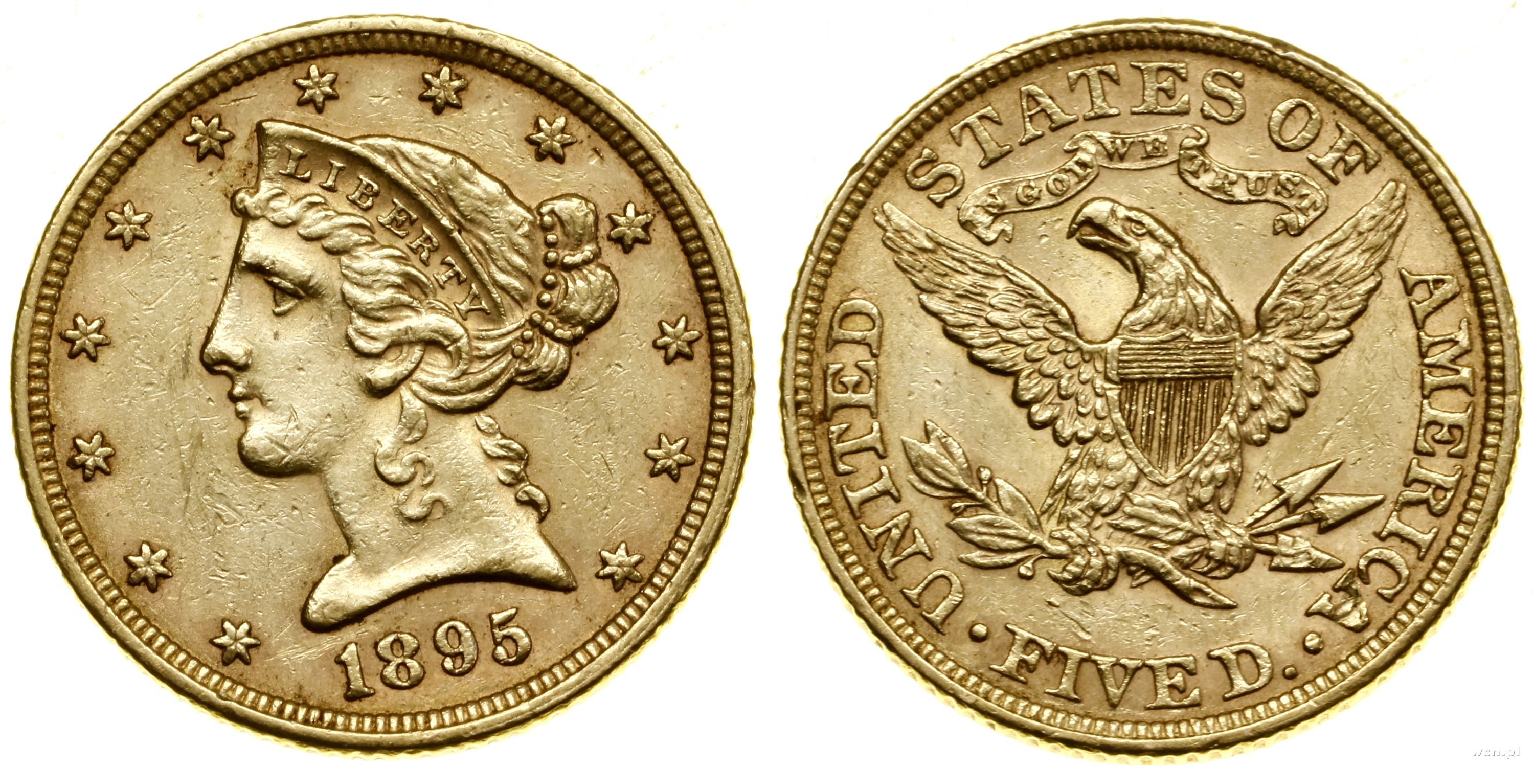 5 dolarów 1895, Filadelfia, typ Liberty with Coronet, motto above Eagle, złoto 8.35 g, próby 900, nakład: 1.345.855 szt., minimalnie czyszczone |