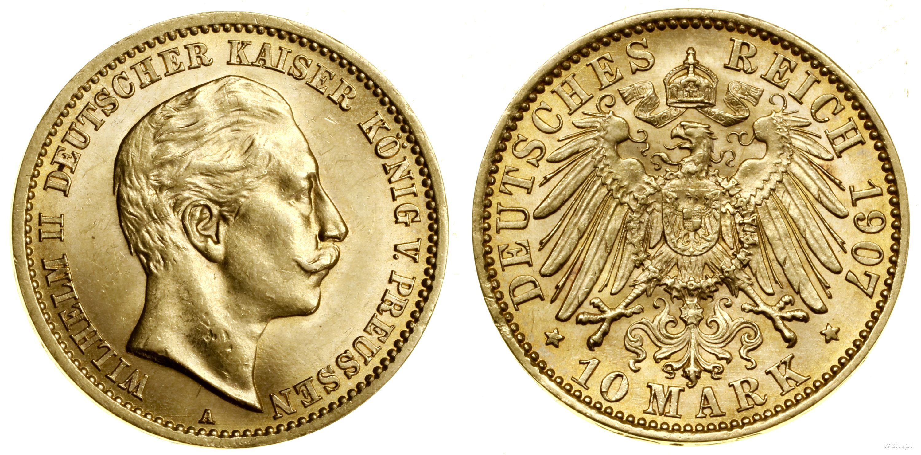 |  | 10 marek 1907 A, Berlin, orzeł autorstwa Schultza, złoto 3.98 g, próby 900, nakład: 812.698 szt. | I/I- | 2 150 zł | 23-10-2025 |