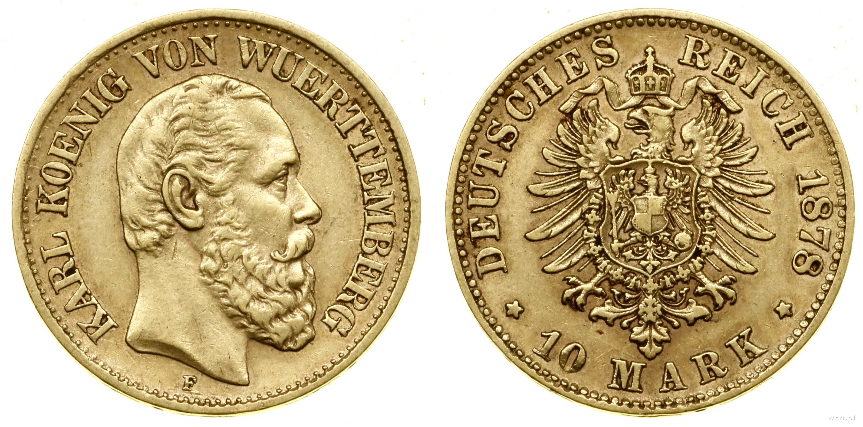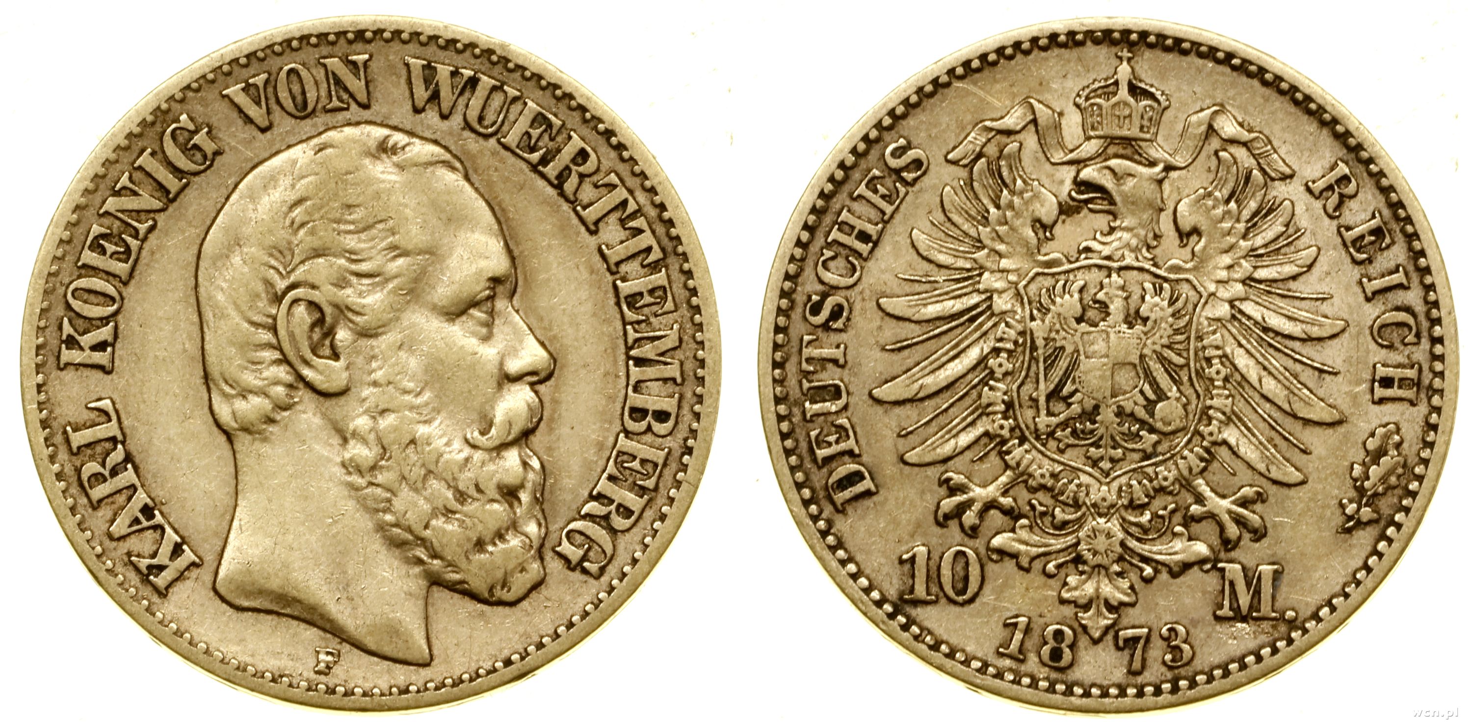 |  | 10 marek 1873 F, Stuttgart, data u dołu rewersu, złoto 3.92 g, próby 900, nakład: 675.434 szt. | III | 1 950 zł | 23-10-2025 |