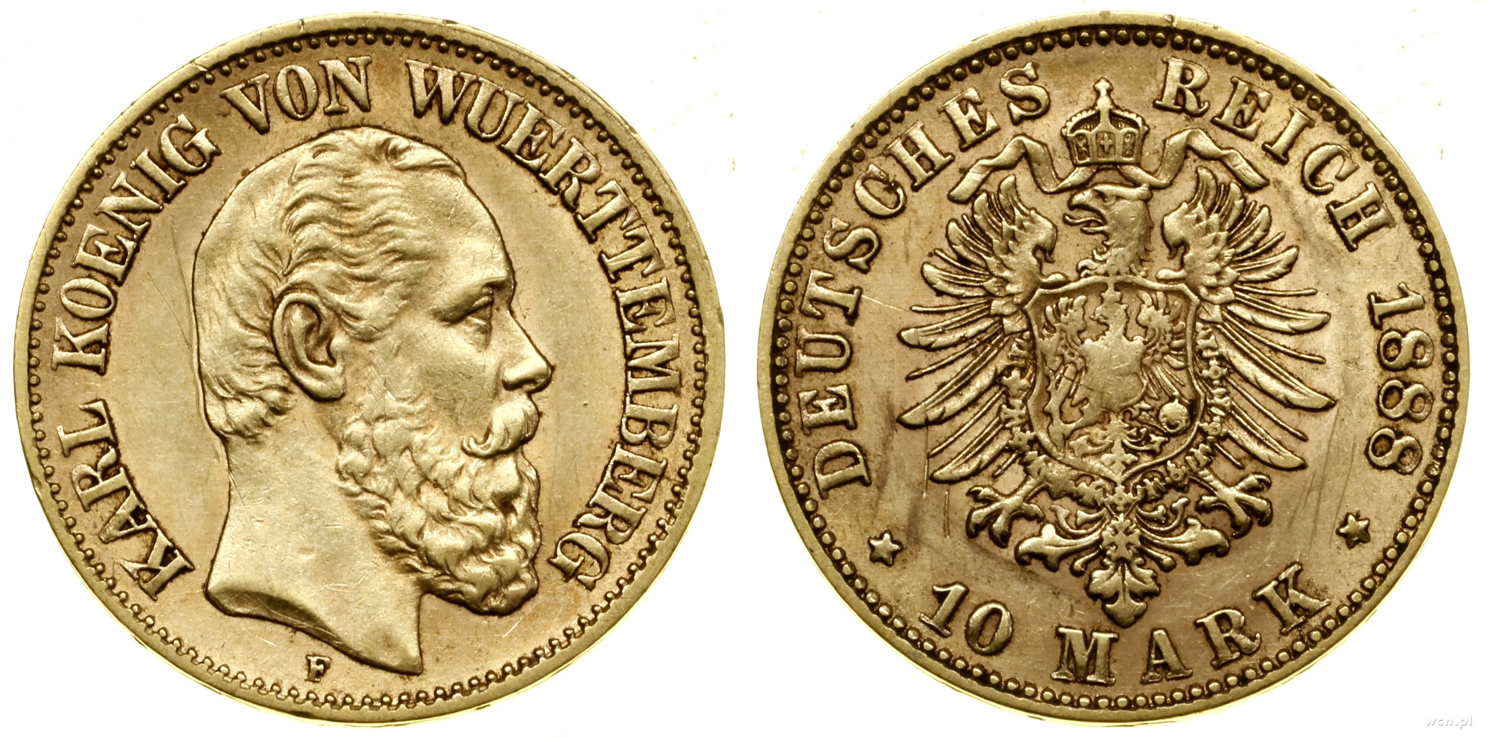 |  | 10 marek 1888 F, Stuttgart, orzeł autorstwa Kullricha, złoto 3.97 g, próby 900, nakład: 200.186 szt., rzadszy | III+/II- | 2 050 zł | 23-10-2025 |