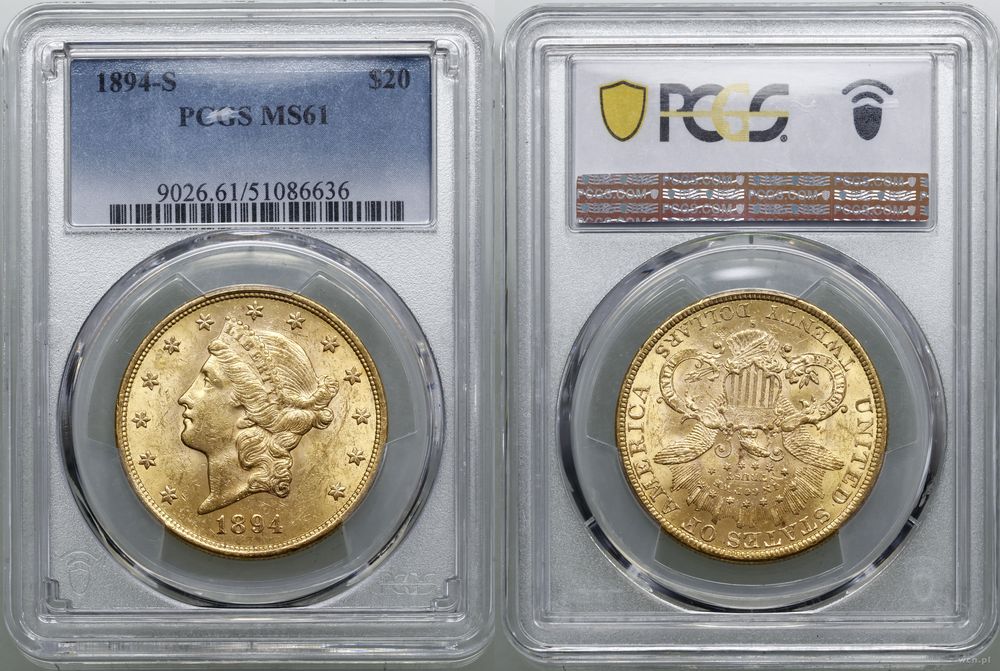 | Opis: | Stany Zjednoczone Ameryki (USA), 20 dolarów, 1894 S, San Francisco, typ Liberty Head, z motto na rewersie i TWENTY DOLLARS |