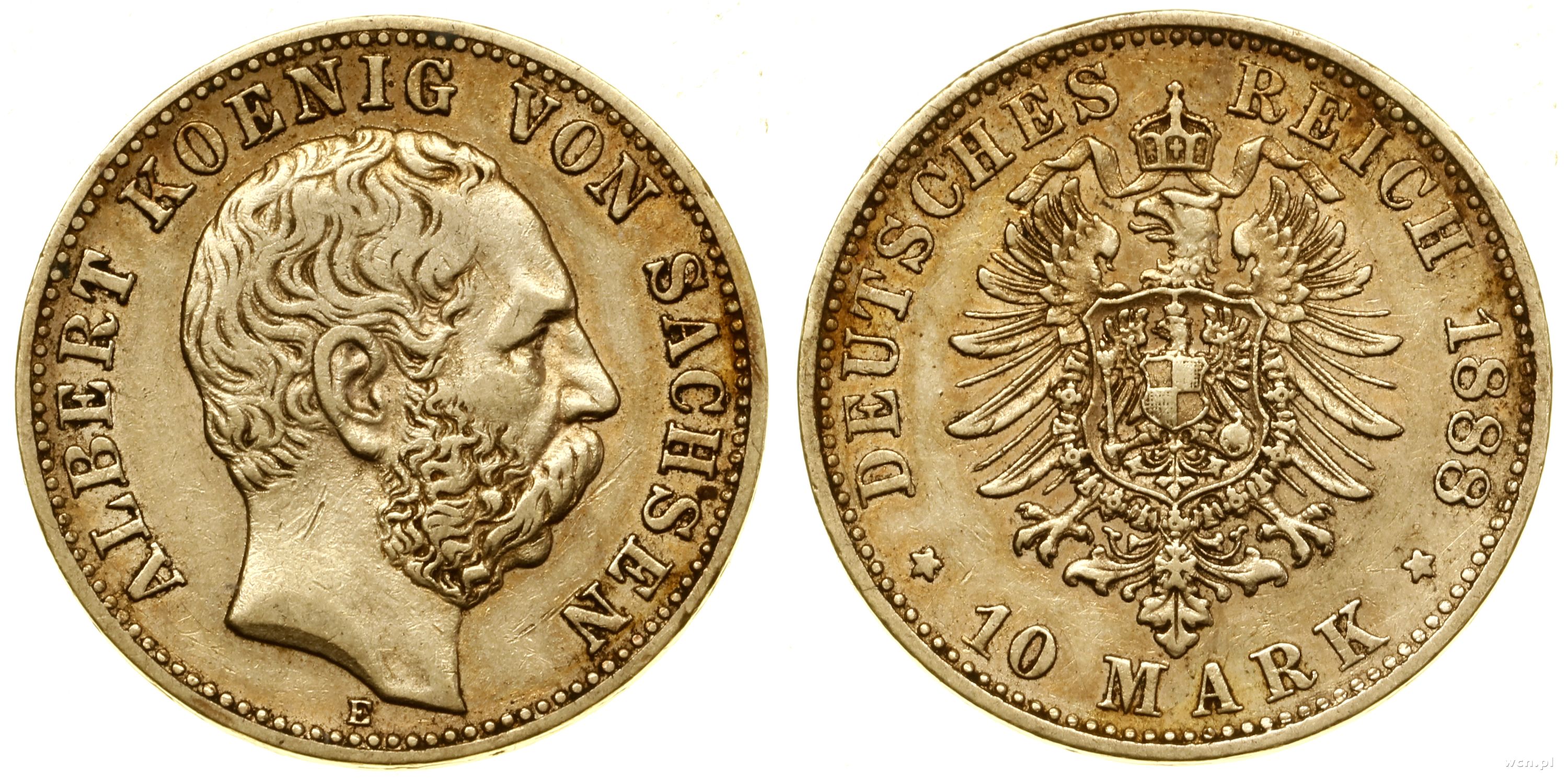 | Opis: | Niemcy - Saksonia - linia albertyńska (1547–1918) - Albert (1873–1902), 10 marek, 1888 E, Muldenhütten, orzeł autorstwa Kullricha |
