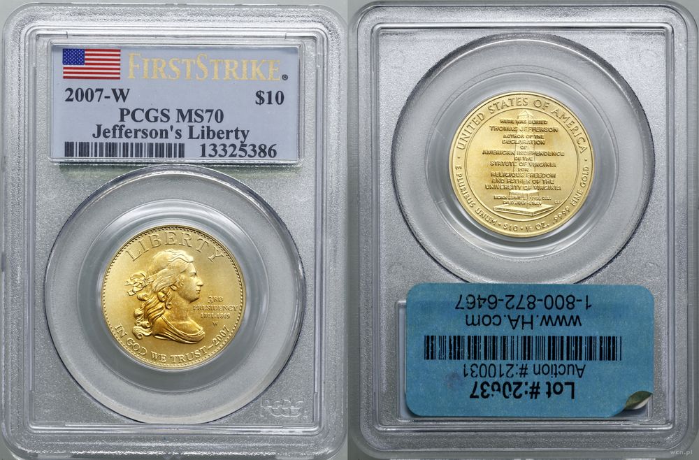 | Opis: | Stany Zjednoczone Ameryki (USA), 10 dolarów = 1/2 uncji, 2007 W, West Point, First Spouse series - Thomas Jefferson's Liberty, stemple zwykłe |
