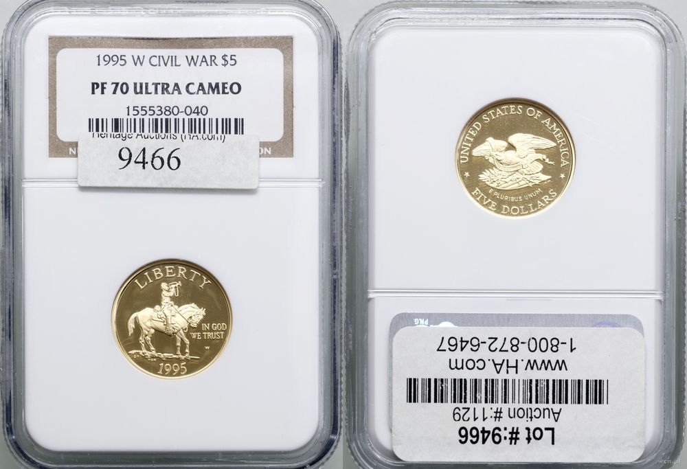 | Opis: | Stany Zjednoczone Ameryki (USA), 5 dolarów, 1995 W, West Point, Bicentennial of end of Civil War, stemple lustrzane |