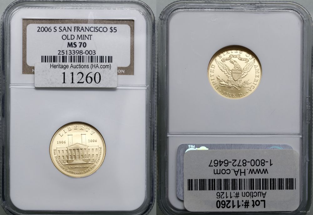 | Opis: | Stany Zjednoczone Ameryki (USA), 5 dolarów, 2006 S, San Francisco, San Francisco Old Mint Centennial, stemle zwykłe |