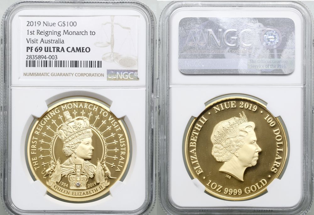| Opis: | Niue - Elżbieta II (1952–2022), 100 dolarów, 2019, First Reigning Monarch to Visit Australia |